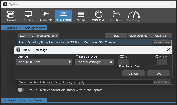 In Global MIDI i try to edit the Next Variation (loopmidi Port | Control Change | 4 | 1) but i get set what i want and even learning gives me no other results.