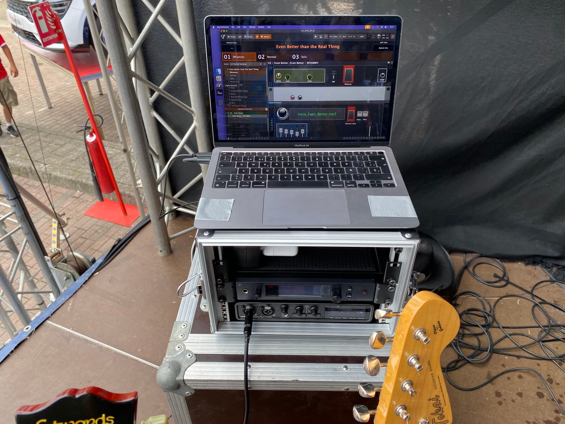 Regarding the hardware, I´ll share some pictures of the rack as we play some shows this summer, but it is basically a half unit rack with a 2020 mac mini m1, a Motu Ultralite V, my IEM emmiter, and a small usb powered router. No need for a super powerful machine for this, I run all these rackspaces with 3 amp emulations, shimmer reverbs and everything and it´s around 28% CPU.