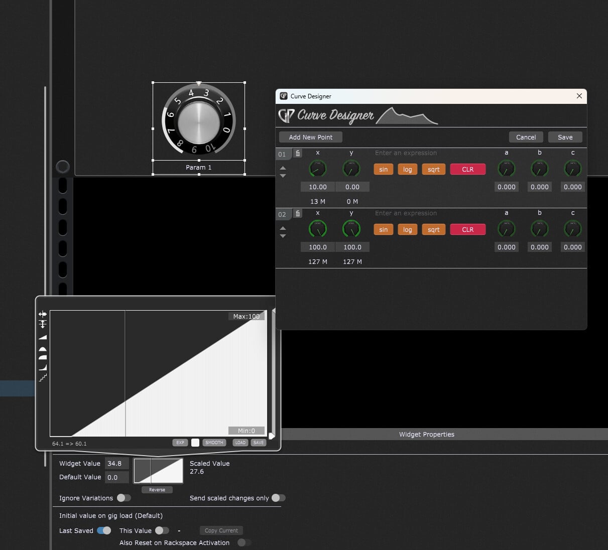 This is a great tip, thank you! And i finally found out how to scale the widget so that the knobs in Gigperformer that go from 0-10 can correspond to the knobs in Amplitube that goes from 1-10 (for instance the fender deluxe reverb), you have to use the Curve designer so that the widget starts on “1”, not “0”. Add new point in the curve designer and set first point x to 10 and y to 0 and second point x to 100 and y to 100. Here is a screenshot: