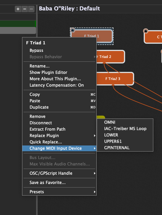 That said, you could still accomplish what we discussed by setting one keyboard to channel 1 and the other to channel 2 (say) and then using MIDI In blocks that only receive on one or the channel but not both. Map the outputs of them all to channel 1 then you’re good to go with your VSTs (first image).
