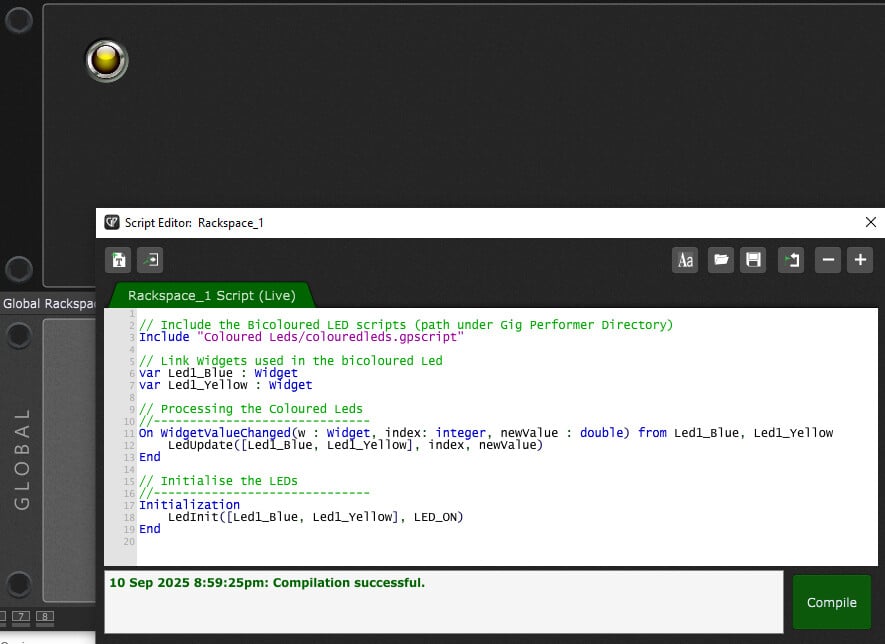 Add the code below into the rackspace script editor. Make sure that the include path to the working script colouredleds.gpscript is in the correct place (optionally the code from the file can be copied into the rackspace script editor). Ensure that the names used for the widget variables match the names given to the widgets in Step 1 and Step 2. Note that the order the widgets are used, is important to correct operation.