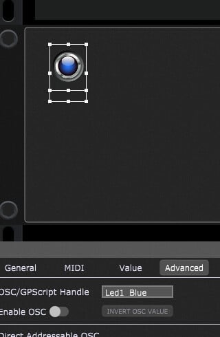 To build a bi-coloured LED, place a LED widget on your panel where it is needed and the correct size (or use an existing LED). Then ensure that the Widget property OSC/GPScript Handle in the Advanced tab has been set as the name of the widget. This is the on colour widget. This widget is used as the control for the LED colour and can be mapped to MIDI inputs, OSC messages or linked Widgets (as in the screen shots above).
