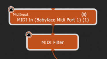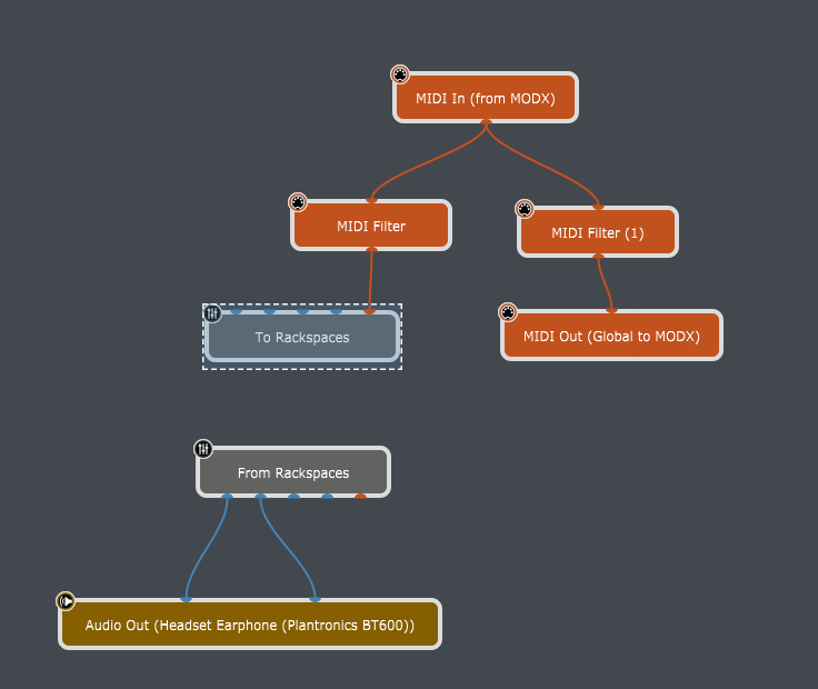 At the same time you could create a second branch for midi-signals to go back out to your MODX which you could use to combine plugins with the internal sound engine of your MODX (also using an additional MIDI-IN block to probably use another split/transpose/…), which can be activated or bypassed at will (–> midi filter).
