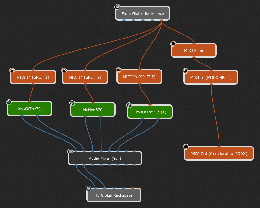 Midi comes in from the Global Rackspace (if not blocked beforehand), then goes into separate MIDI-IN blocks (“Midi Merge” must be enabled!) to realize any splits or transpose, or…