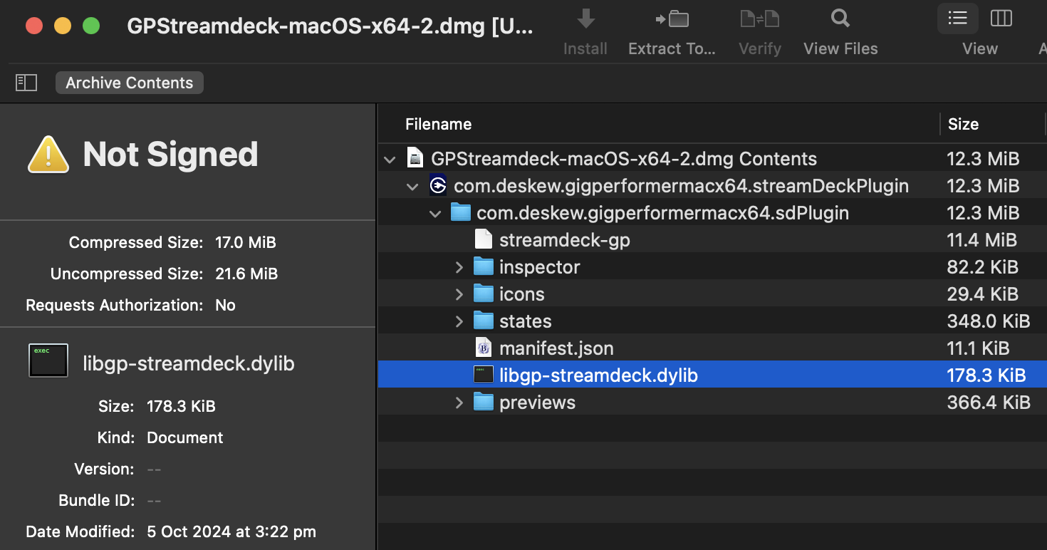 Hi - I have tried to install the Gigperformer Streamdeck plug in but I am not seeing any .dylib file automatically installed. This is on ARM64 on a Mac Mini M2 Pro running Sonoma 14.5. Everything else seems to be there. Is there a way to get the .dylib file and drop it into the Extensions folder? I have tried a blank gig file and restarted and tried several times but also get the same on my Mac Studio. Any ideas?