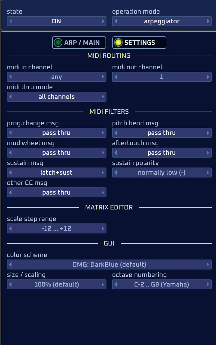 As @schamass noted, BlueArp works ‘out of the box’–just connect it and the notes are processed inside the plugin and passed through.