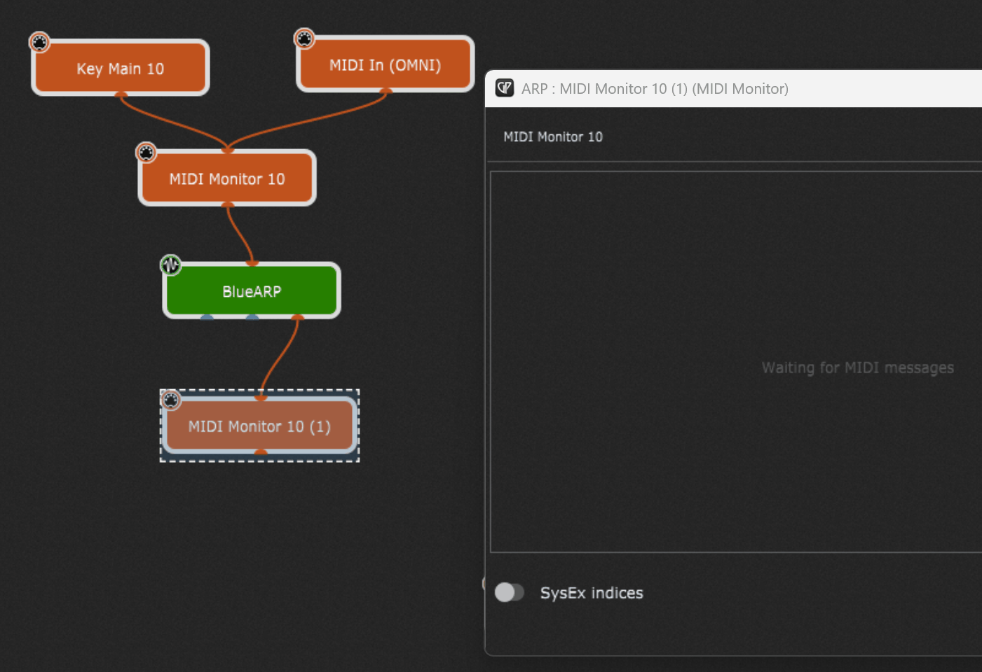 I’ll set up a simple one. I already tried MIDI monitors at the front and back. No signal was getting through to the BlueARP. It’s as if the ARP is filtering everything and letting nothing through.