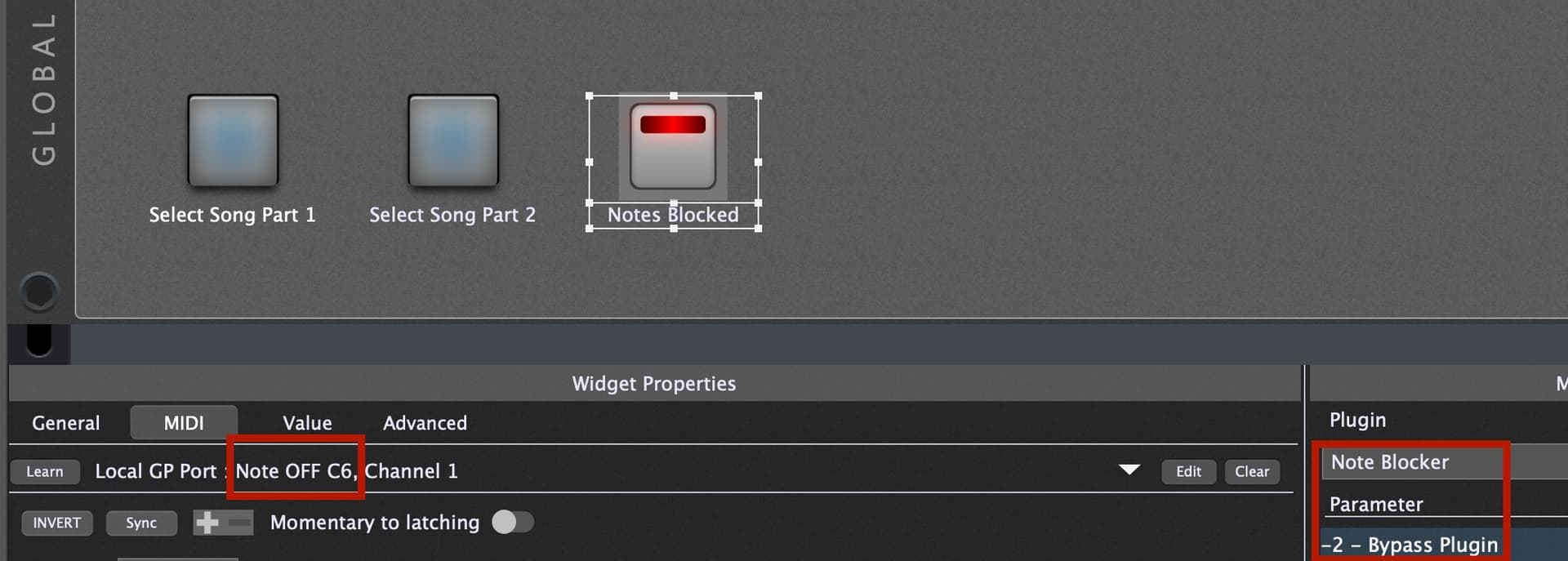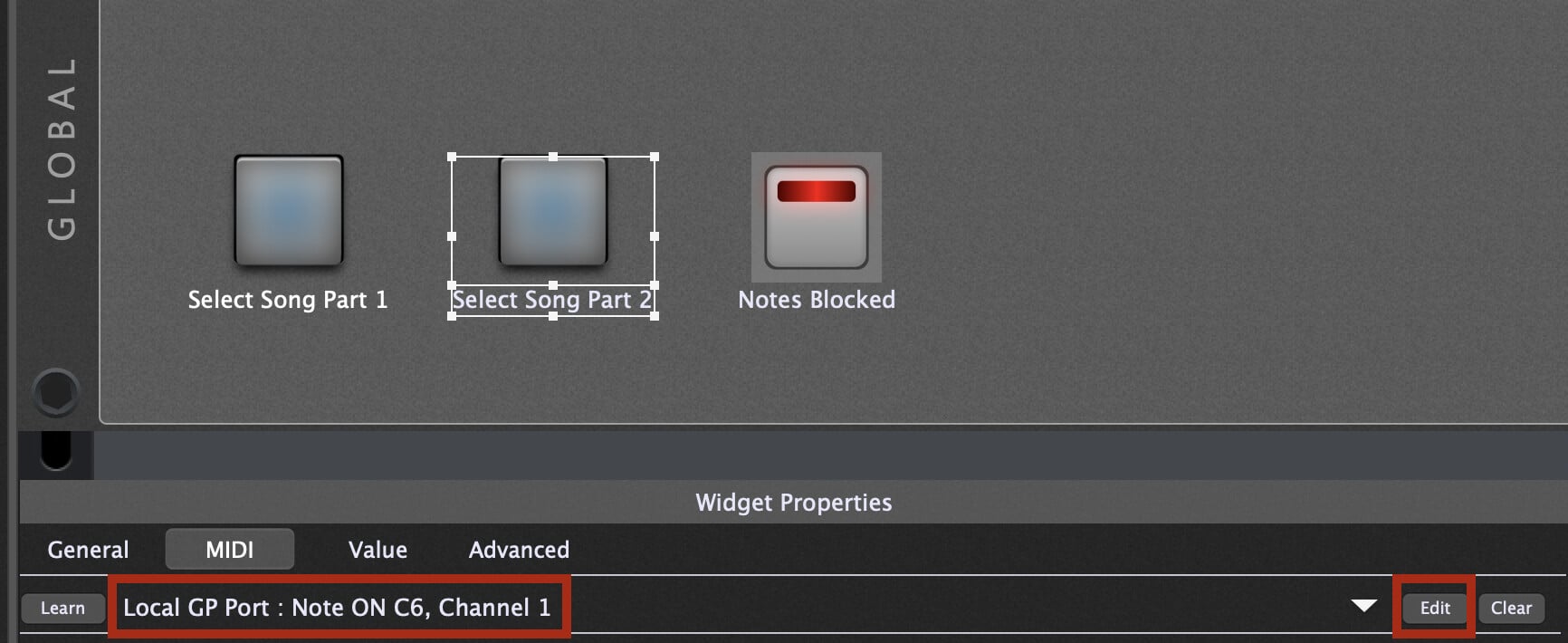 In the Global panel, I have widgets mapped to System Actions to select the song part. I used the ‘Edit’ button for the midi mapping and selected the GP Local Port