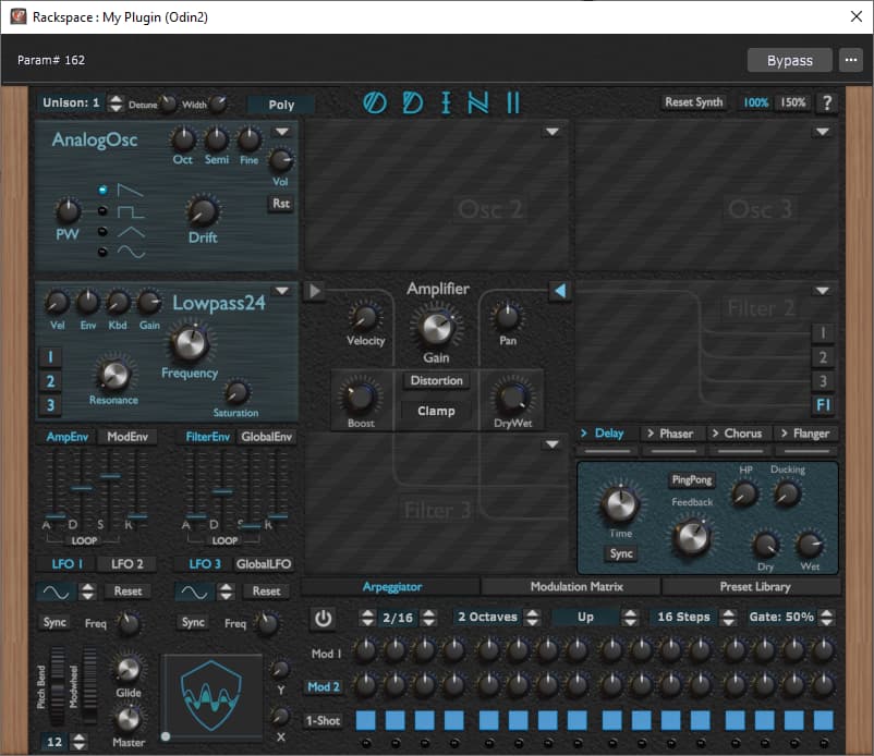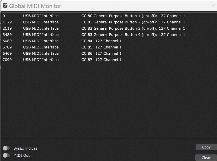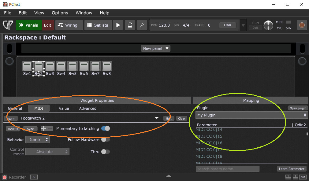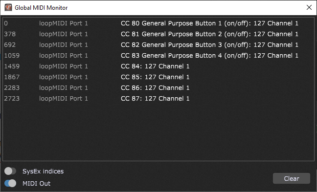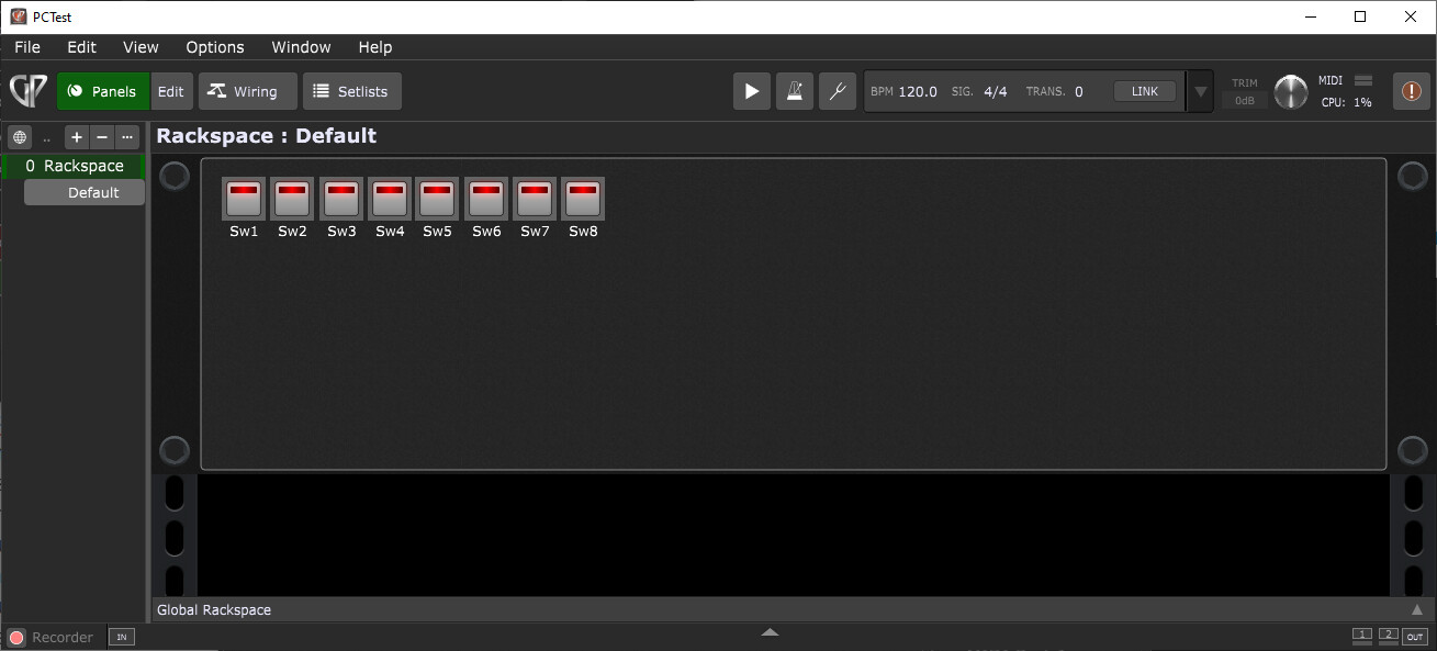 You should now have each of the buttons on the rackspace panel toggling with each switch press. The global MIDI monitor should show this when the foot switches are pressed.