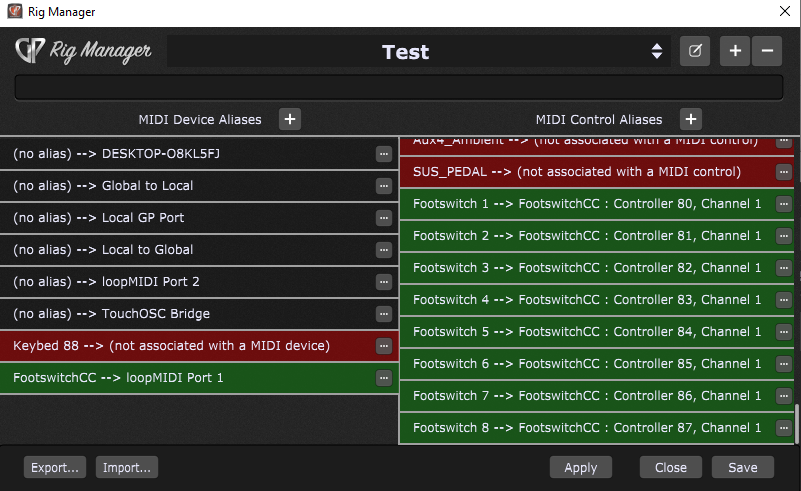 redid my Rig manager and loaded new gig file. created the footswitch control aliases and learned them, then went to widgets and linked each to a pedal (at first they didn’t work because they were assigned to your loopmidi which i didn’t have, but I set them each to the respective alias in the dropdown menu and they all work. SO READY for the next step LOL How do I assign them to Samptank mute buttons?