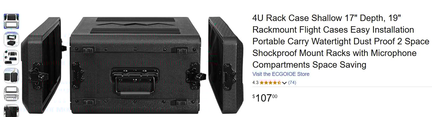 Rack case: it’s an Amazon cheapo, but I love it. Rails in front and back and storage pockets in lids. Molded feet on sides → LINK