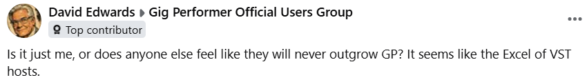 Not the best photography, but here’s my rig (set up in the home office for practice and patch configuration). In the rack is a Geekom i7 PC with 2 SSD and 64 GB RAM plus a MOTU M4. Windows 11 all stripped down. Gig Performer is my host. VSTs: