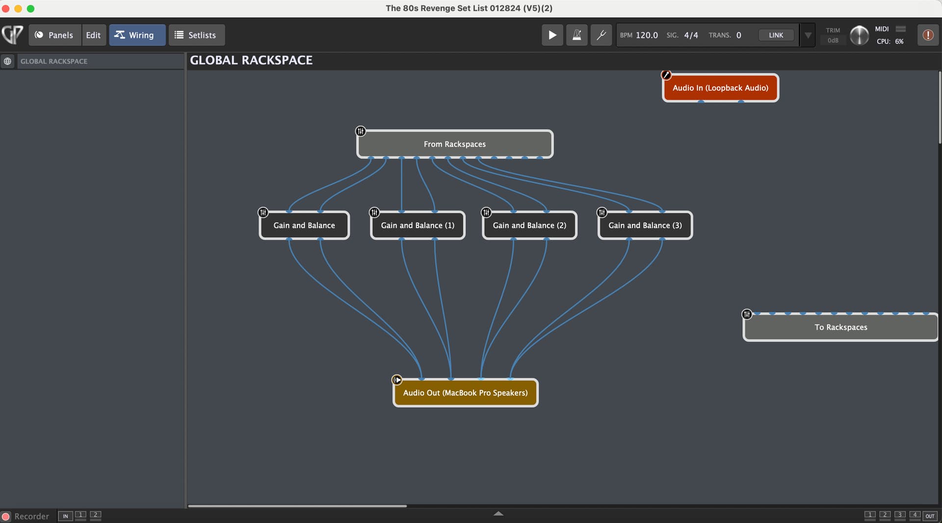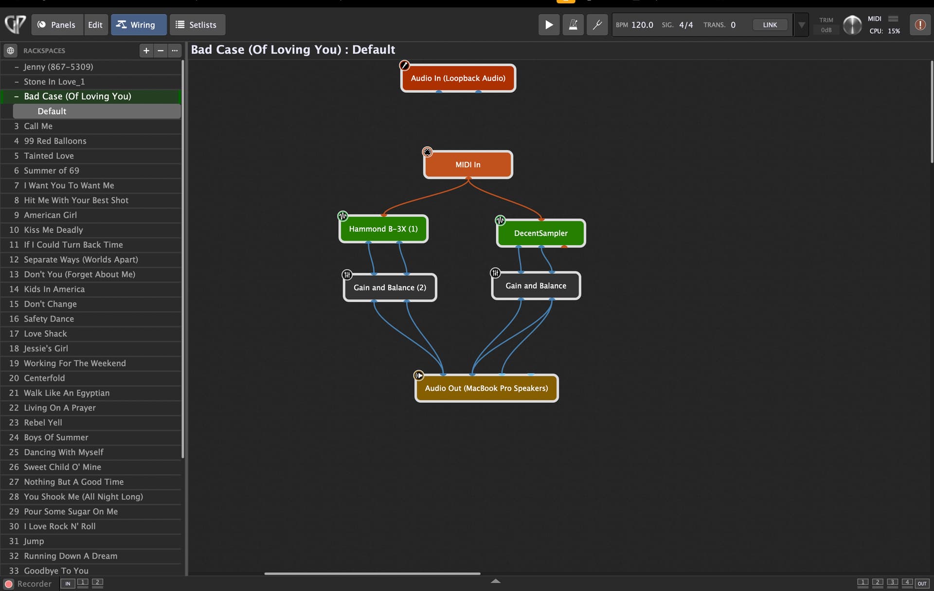 I’ve attached the screen shot of the local rackspace for one of the songs in the set list. All are set up the same way (note that right now I don’t have the presonus audio interface turned on so the audio out is the macbook but normally the audio out block would be the presonus)