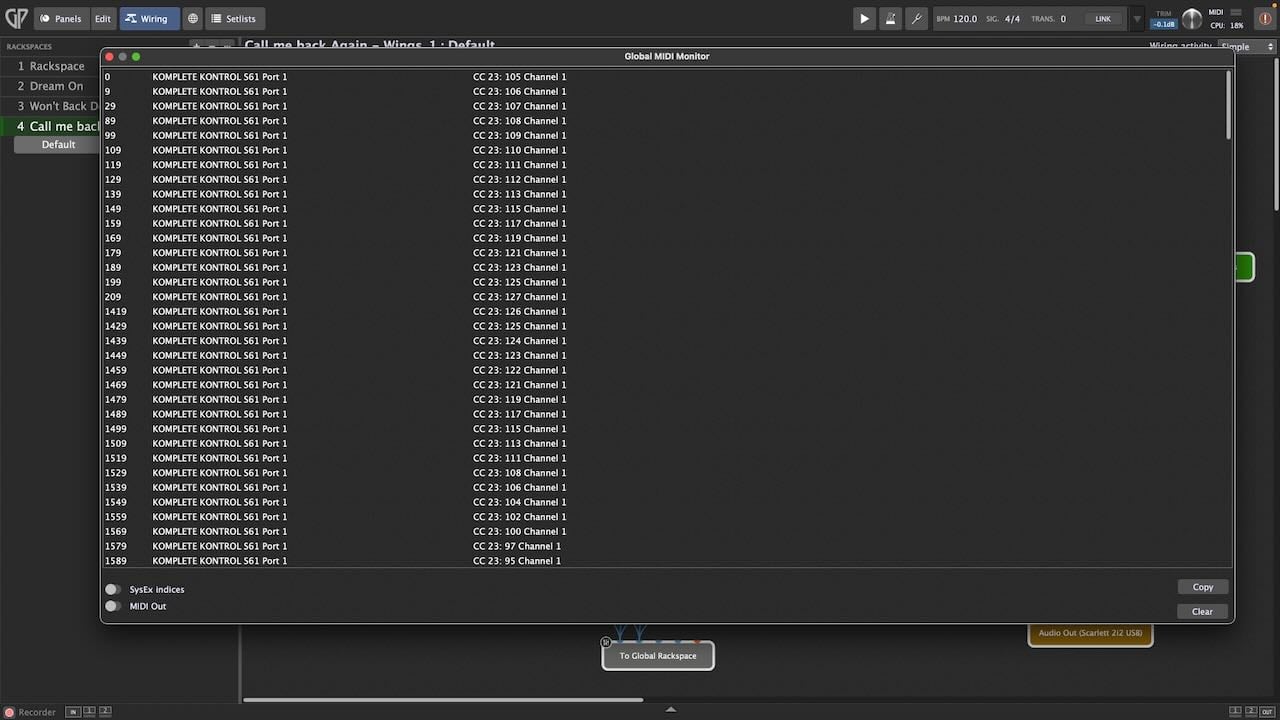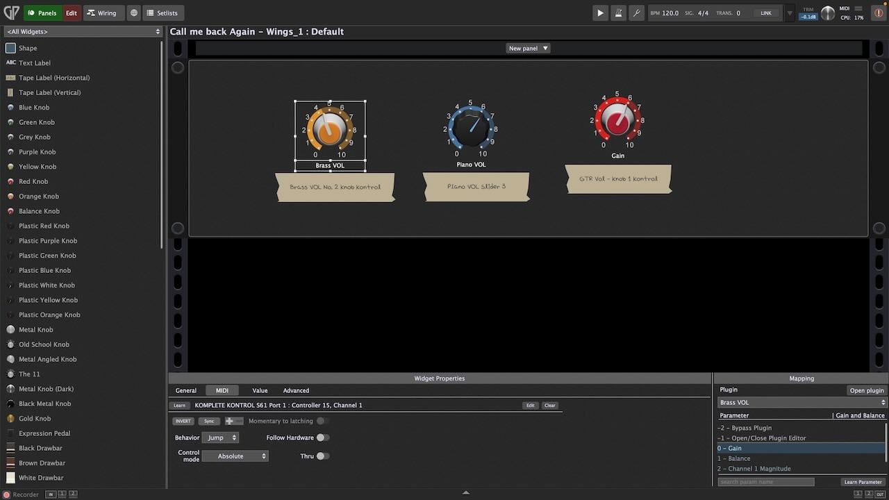 Hi - first time poster, been using GP for 6 months. My upper keyboard is a Native Instruments Komplete Kontrol S61 (first ver circa 2014). I have set up widgets in GP to simply control volume with one of the knobs on the S61. But I have to turn off this keyboard at night due to those bright blue lights (but I keep my computer and GP running). When I turn back on my Komplete Kontrol S61, GP always recognizes it. But 1/2 of my widgets that I set up don’t work and I have to re-set them up (even when I’m at a gig which is really a problem). For example, I set up say 30 rackspaces, all of which have a volume gain controlled by a widget which I used ‘learn’ and set up that same knob on KK S61 to control. Then I do save that rackspace and save the gig file. Then I turn off my KK 61 of course to get to the gig. When I turn back on and load up the gig file, about 1/2 of my widgets controlling that knob don’t work. This doesn’t happen with my bottom keyboard - Yamaha CP4. All widgets work exactly like they should but not on the KK S61. Granted it’s an older keyboard but in GP, it always recognizes it, and the midi green light is blinking when I move the knob on the KK, but it does not control the widget until I go in and re-learn it. This is not feasible in a gig since I just don’t have the time before we start playing to re-learn about half of all widgets. Granted I’m not using a template so these rackspaces have been ‘manually’ set up by my using ‘learn’ feature. Any suggestions? Thanks in advance.