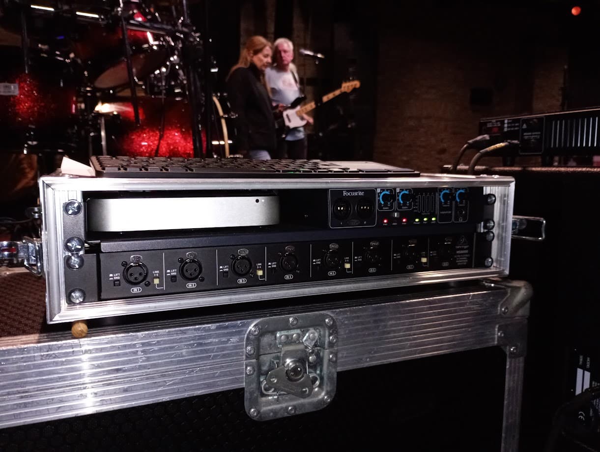 A 2U rack with; Mac Mini (late 2012) Catalina 10-15, Focusrite Saffire Pro 24, Behringer Ultralink MS8000 and an Internal Dual Output DC 5V/4A 12V/3A PSU.