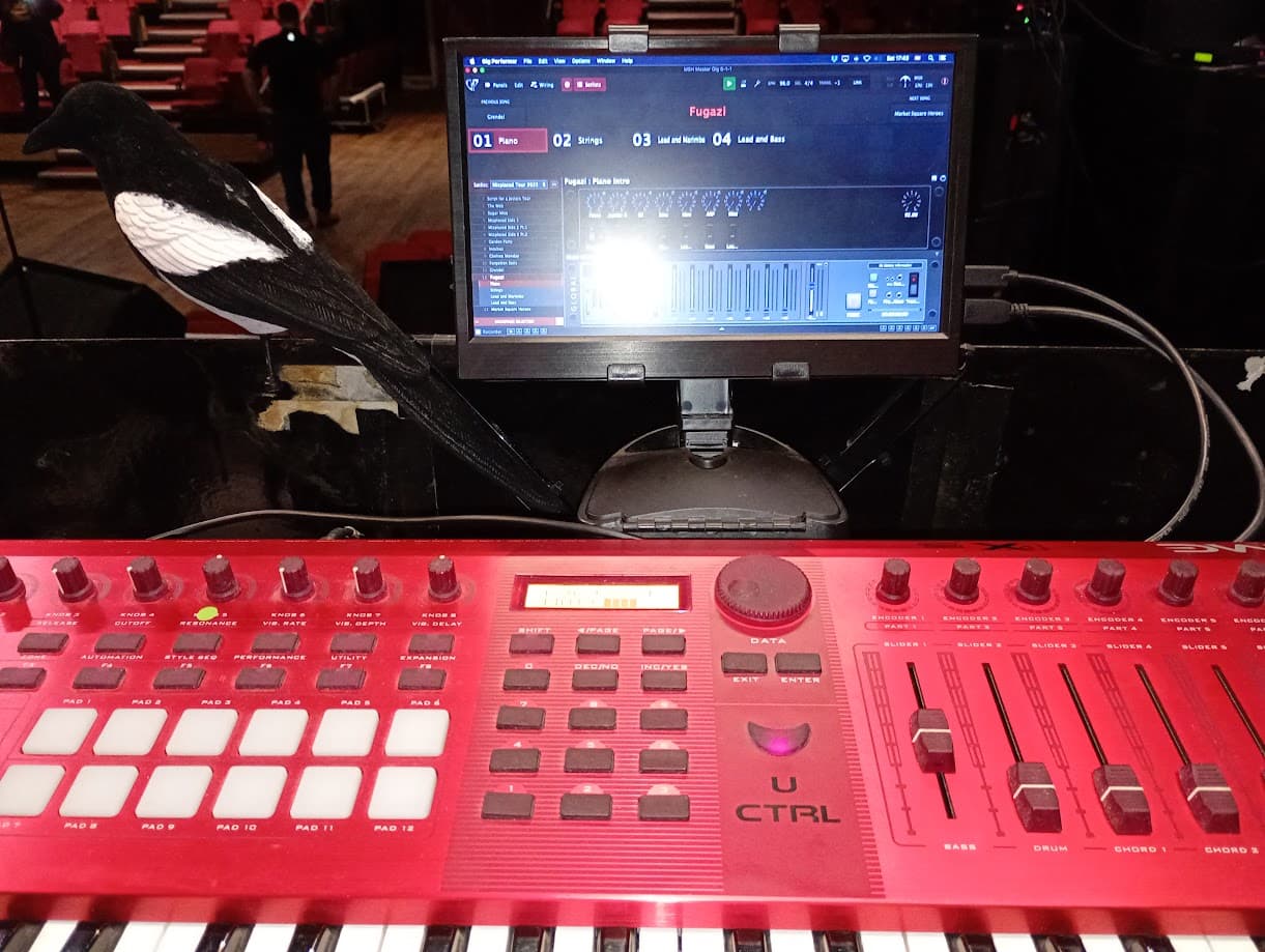 On the back panel are the HDMI, Ethernet, 4 USB ports, 4 XLR Outputs, 2 XLR Inputs and 2 dedicated USB Power Ports. The internal PSU provides the two USB power ports and the power for the Audio Interface. The audio interface outputs go to the Ultralink and provide DI for Keys L/R, a Click/Tap Output and a local Mono Monitor Output. The optional wired IEMs are provided via the Focusrite Headphone socket. One USB power port and HDMI power the monitor (sorry about the glare) on the top of the stand. One USB to each board job done.
