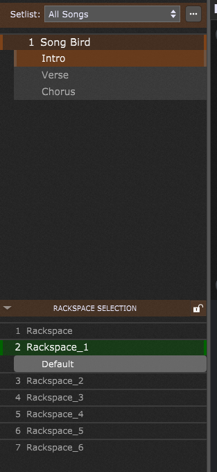 Set lists are a collection of “songs”. Songs use rackspaces. Songs can have multiple parts each part can use a different rackspace. In this example there is a song called “Song Bird”, it has three parts (Intro, Verse, Chorus). Part one is using Rackspace_1 that contains all the plugins needed for that song part.