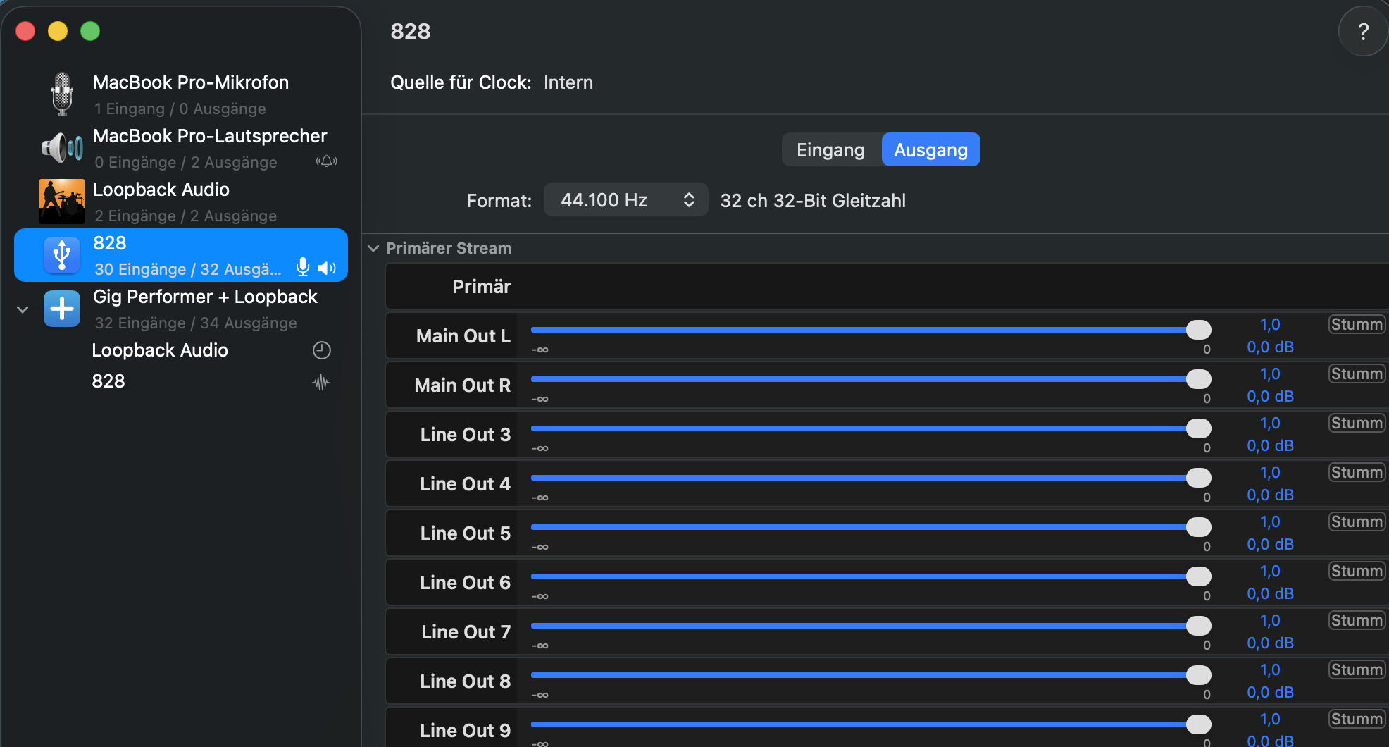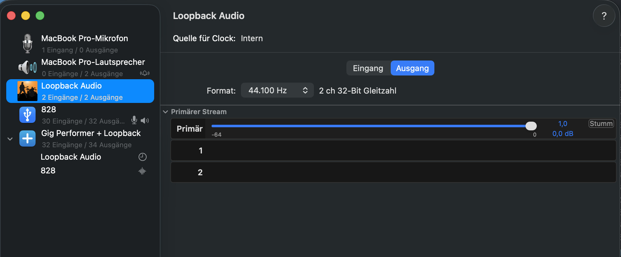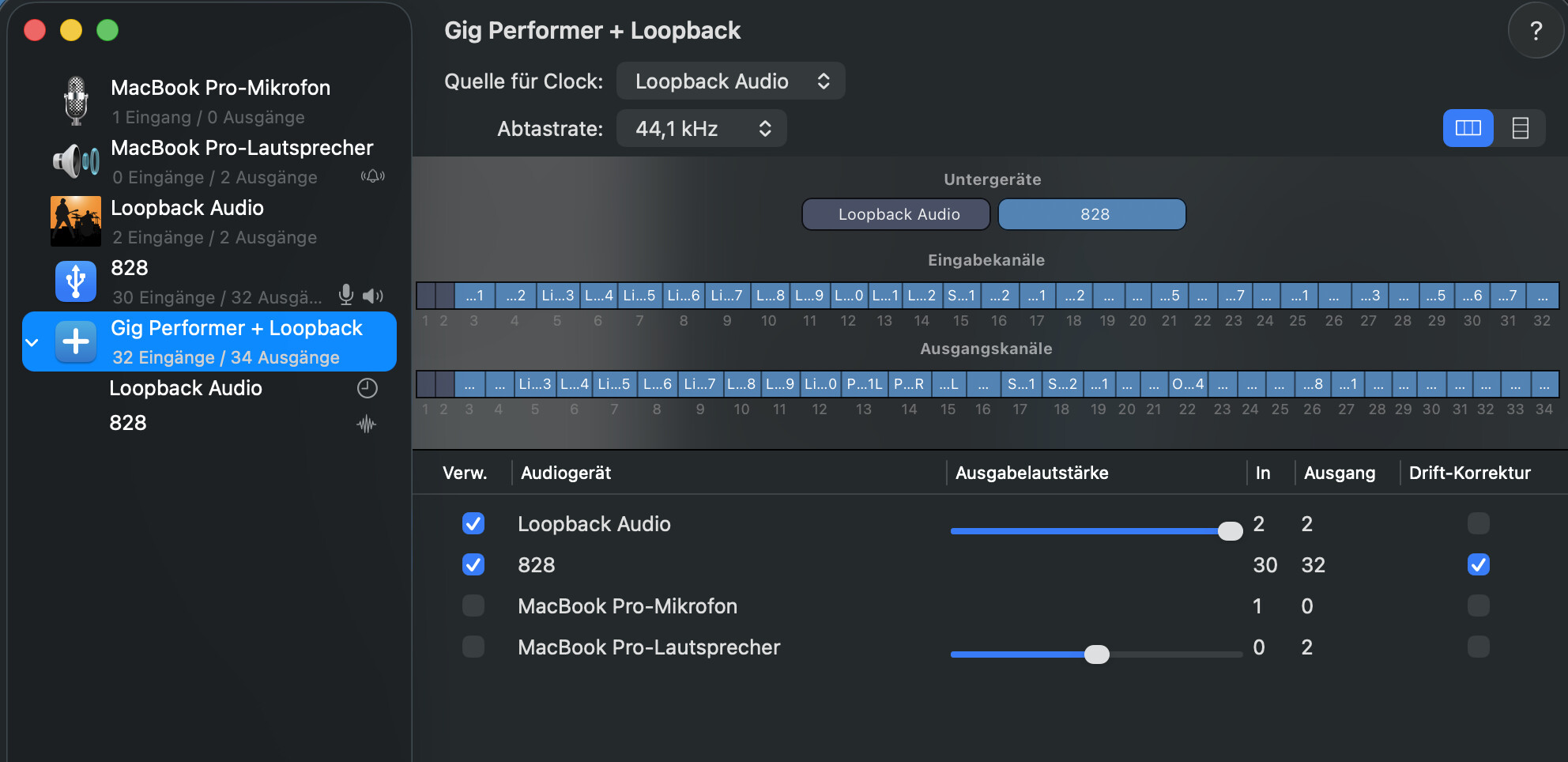 I’ve finally figured out what you mean by “aggregate device.” In my case, it’s called “Hauptgerät” (main device). I was able to create it as a standalone audio interface in the Audio MIDI Setup (named: Gig Performer + Loopback). It’s now also set up in GP. Apparently, Songmaster didn’t like it, and now I can’t play any songs there. The play button is unresponsive. Whenever I try to change the audio interface in the settings, it crashes. I’ve reinstalled Songmaster, but it still crashes. It also crashes when I try to close Songmaster normally. I then restored the old settings (in GP: Audio In - Loopback, Audio Out: MOTU 828). Suddenly, Songmaster worked again. I could access the settings again. In Songmaster, I immediately switched to the computer’s speakers. After recreating the aggregate device, I was able to access the Songmaster settings again and configure the aggregate device there as well. There must have been a conflict with the audio interfaces, since different ones were configured. This was quite a tough job for me, but thanks to you all, I was put on the right track.
