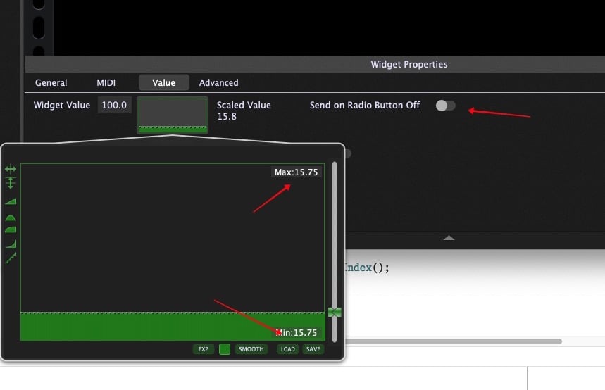 E.g, if you want one radio button to send MIDI program change 42 then you click on both the Min and the Max and set the value of both of them to 42m