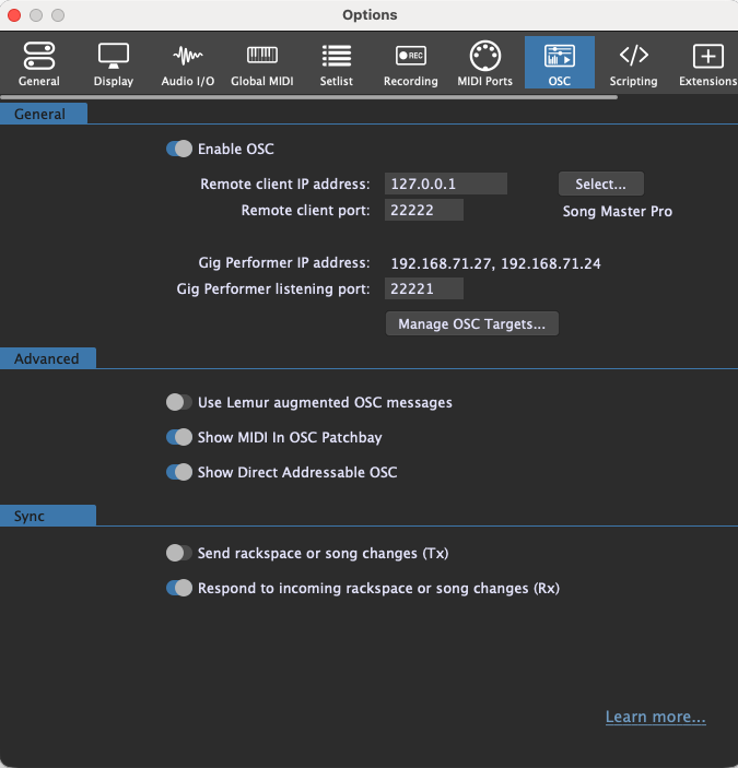 In Gig Performer, create an OSC target for “Song Master Pro” and activate OSC. It’s also important to activate “OSC direct addressable.”