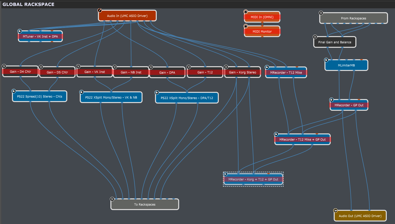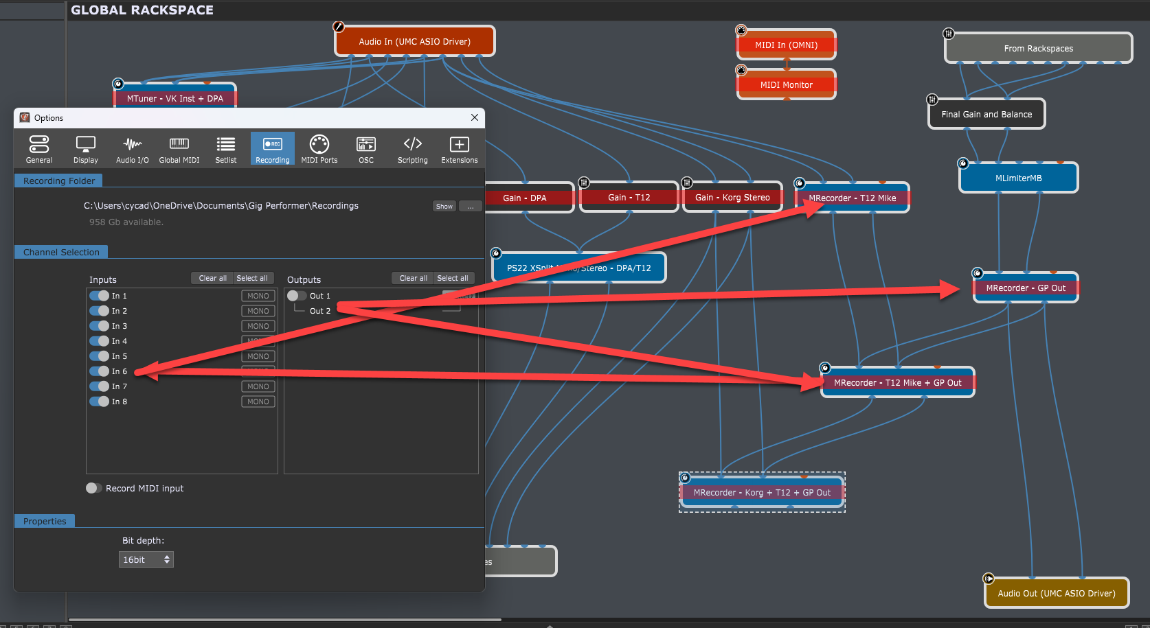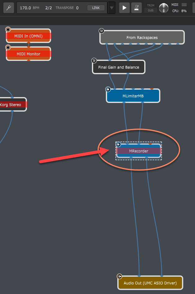 You can put the Melda plugin anywhere you like, with as many instances you like, and route what you want any specific instance to do. In the example below, the raw input signal from one of my mikes (could be your guitar?) is being recorded; the output from GP is being recorded, both are being recorded to the same file, then I could combine that with my Triton Rack and record it. I could put more outputs on my audio out block and send the whole thing somewhere else, or any part of it. I could put Recorder blocks in for each input for mixing later. I could put Recorder blocks in any part of any Rackspace. Or route any part in any Rackspace into the Global Rackspace and record that, or combine and record with another signal, or input, or… As far as I can tell, you could accomplish just about anything you wanted to record given the constraints of whatever it’s possible to do with any plugin hosted in GP. This is not a workaround - it’s a utility plugin with many powerful possibilities - and it’s free.