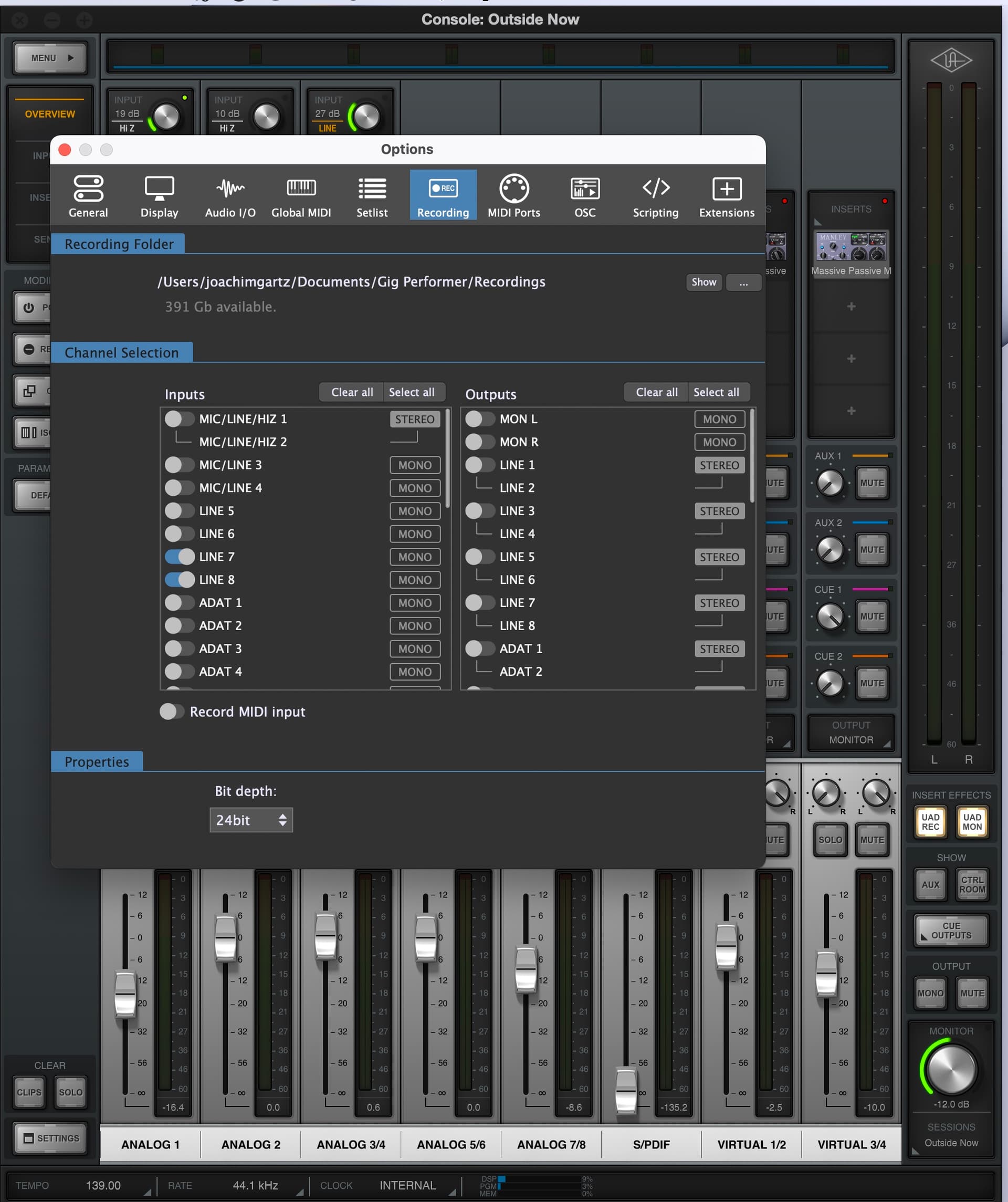 On the two screenshots you see, what I need. I need a recording of Input Analog 7/8 an Virtual 3/4 of my Audiointerface (apollo8). This is very easy to do with Gig Performer, but you get separate files for Analog7, Analog 8, Virtual 3 and Virtual 4.