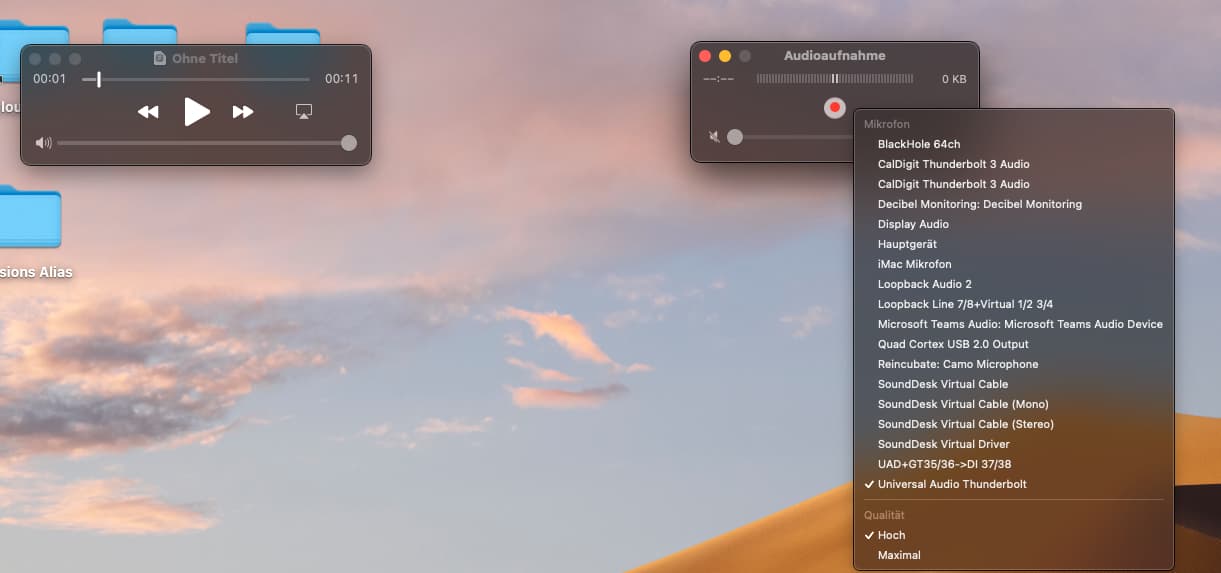For a Mac user you got the following quick and dirty solution. use the QuickTime player, choose audio recording and then select your audio interface. I have used this before, but then I have forgotten that this really easy solution exists.