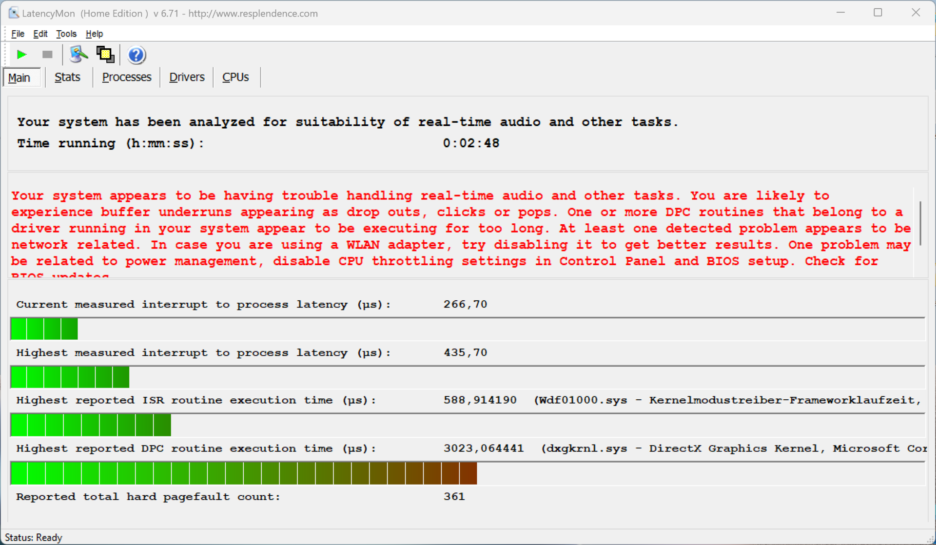 My current Asus laptop (Windows 11) from two years ago also reported a similar warning in LatencyMon but after I disabled CPU Throttling then the warning has gone and now the value of ‘interrupt to process latency’ is between 60 us to 232 us.