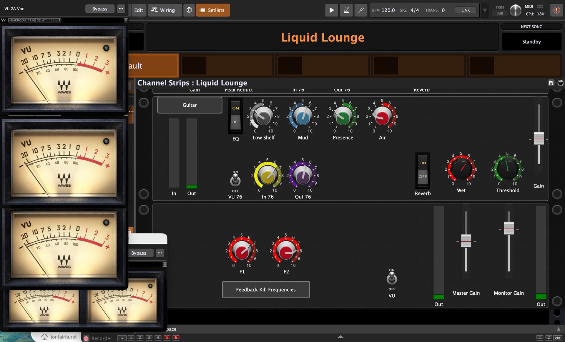 The first thing you might notice is the VU meters for various stages. I’ve also got monitor widgets to detect peaks. The first VU meter is after a CL2A compressor for vocals. The second is after the 1176 vocal compressor. I only expose the knobs related to gain and threshold, as the ratio and attack/release are predetermined. the third VU meter is after the 1176 compressor on the guitar. Each VU meter has a switch so I can make them visible/hidden. The main reason is that I layer them so the meters hide the faff, rather than the other way around.