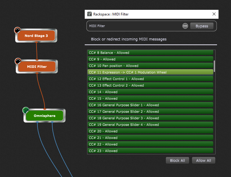 The Nord Electro 6 has a control pedal input so if you have a control pedal you can use it to modulate everything as you can with the modwheel. Maybe you have to activate control change in the NE 6 system menu (I only have a Nord Stage 2 + 3). The connected pedal will then send out CC 11 (Expression) messages. You either configure Omnisphere to react to CC 11 or you use the GP MIDI Filter to map CC 11 to CC 7 (Modwheel) so Omnisphere will never know you don’t have a modulation wheel