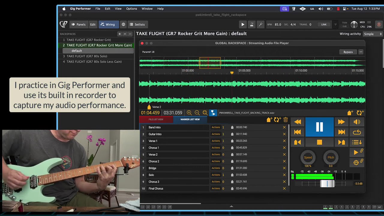 This video shows how Patrick uses Gig Performer 5 to practice, record, and command rackspace, plugins and effects chains on the fly using song markers in the Streaming Audio File Player, the plugin included in Gig Performer.