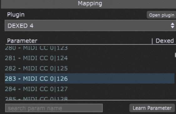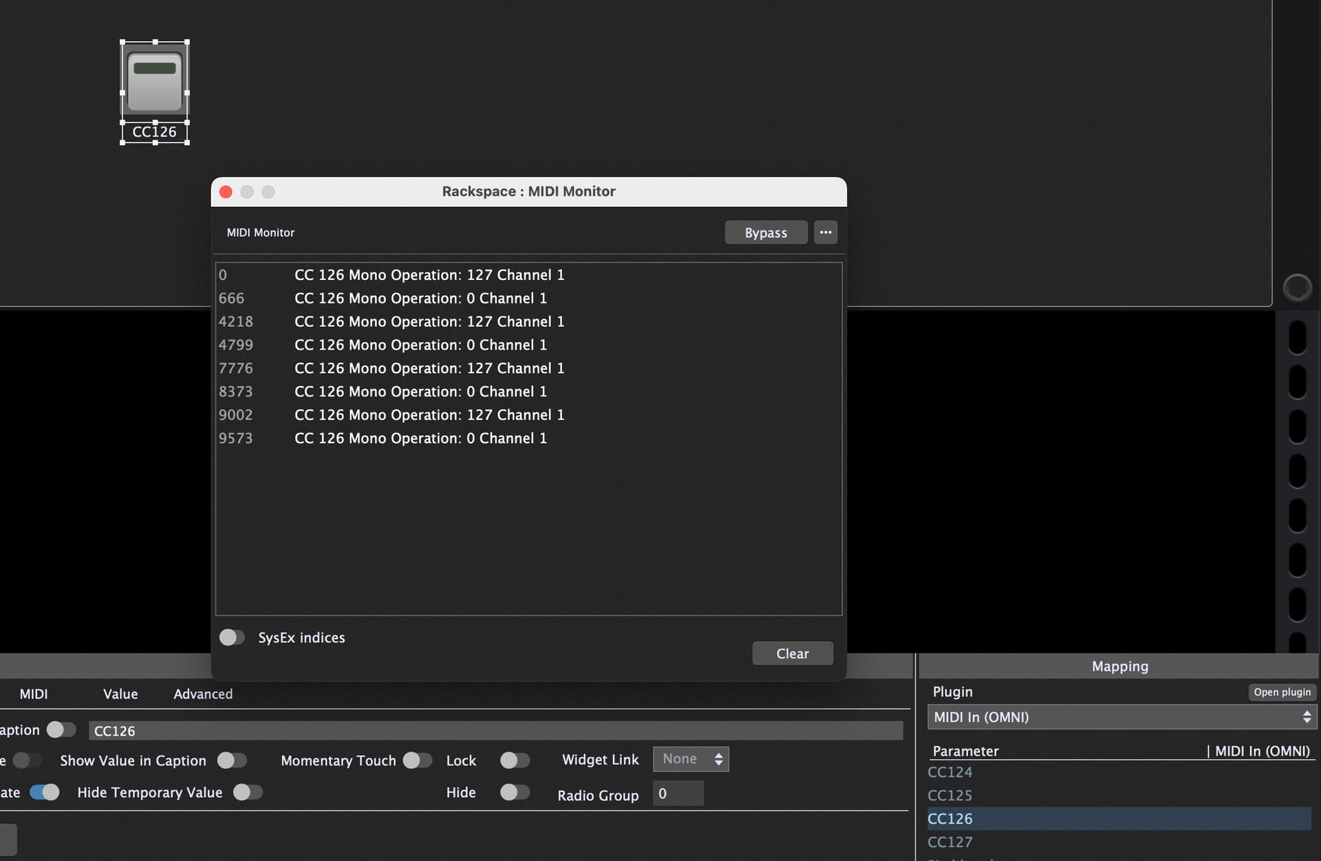 The plugin doesn’t react on CC#126 wether if it is send from a MIDI-IN block, nor if it comes from a widget directly (selected from the parameters list).