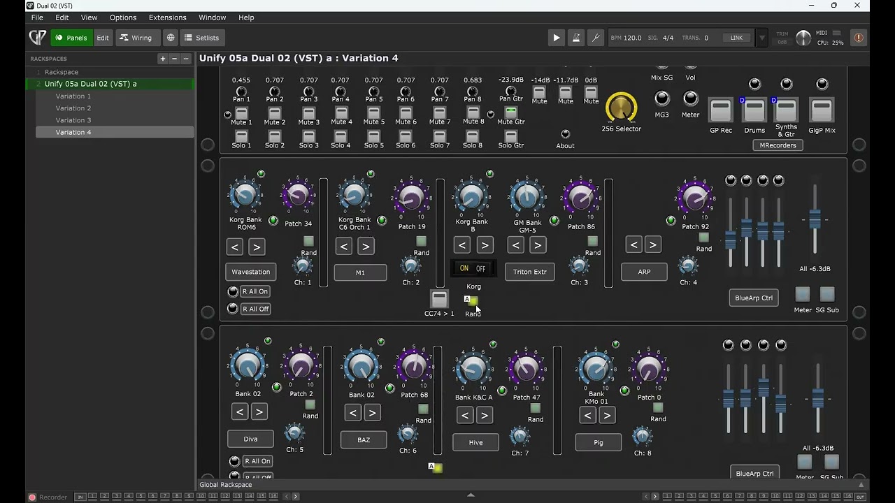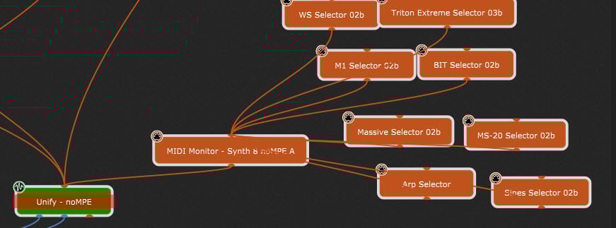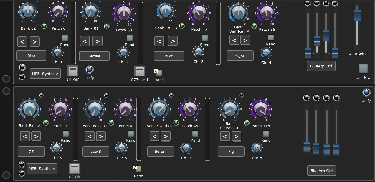 Actually, I did not Unify any of the patches for the eight synths in the rackspace. What’s going on patch-wise is that scripts in GP are generating MIDI PCs which are routed via the wiring diagram into Unify (on separate channels for each synth) where the synths have been selected for (among other things) their ability to switch to new patches/presets in response to PCs. Depending on the synth, different steps may be necessary to enable/configure this.