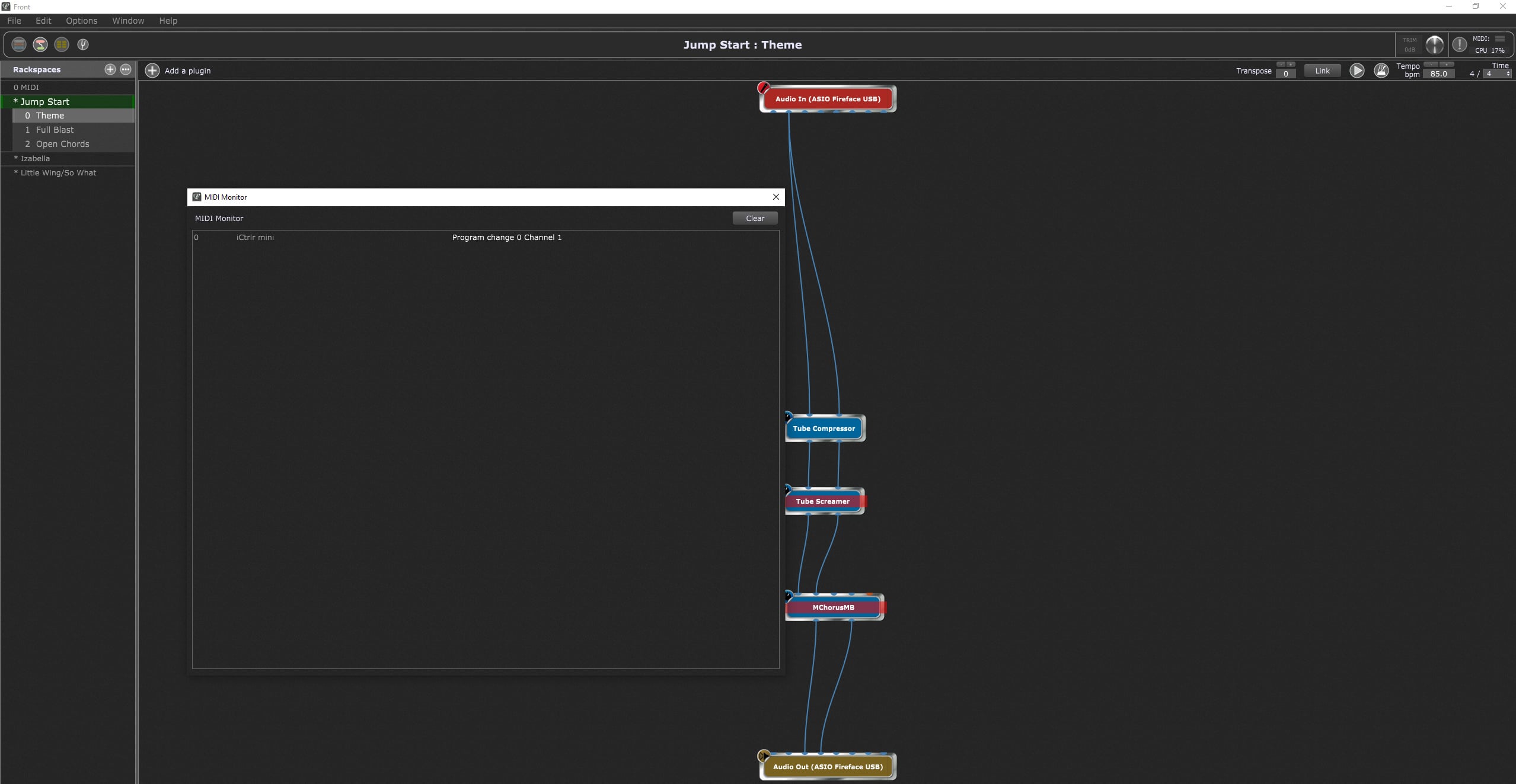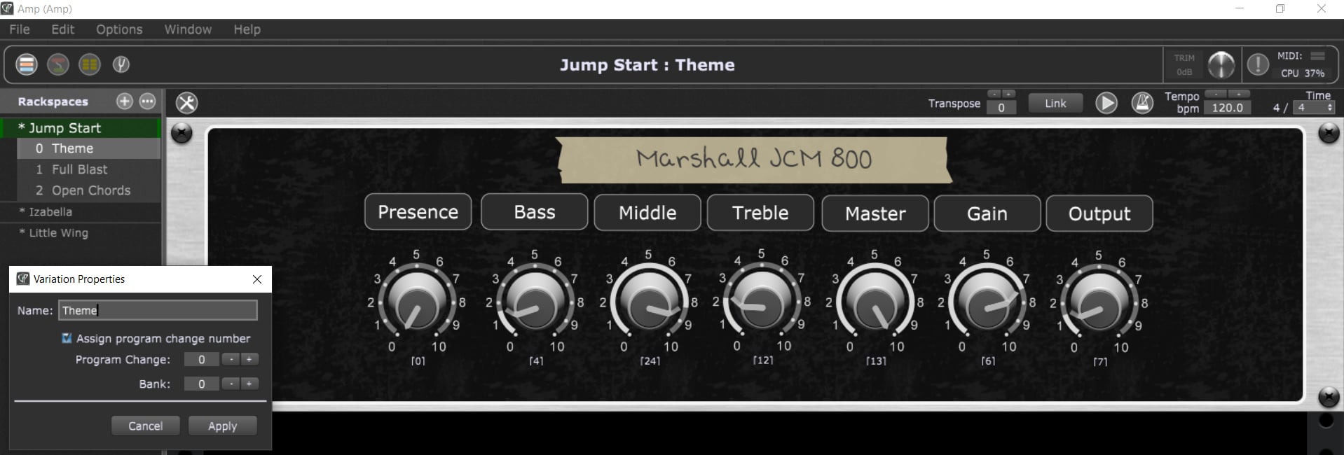 I am in the “MIDI” rackspace. I have program 0, 1 and 2 linked to “Jump start” variations. Programs 3 and 4 aren’t assigned to any rackspace/variation.