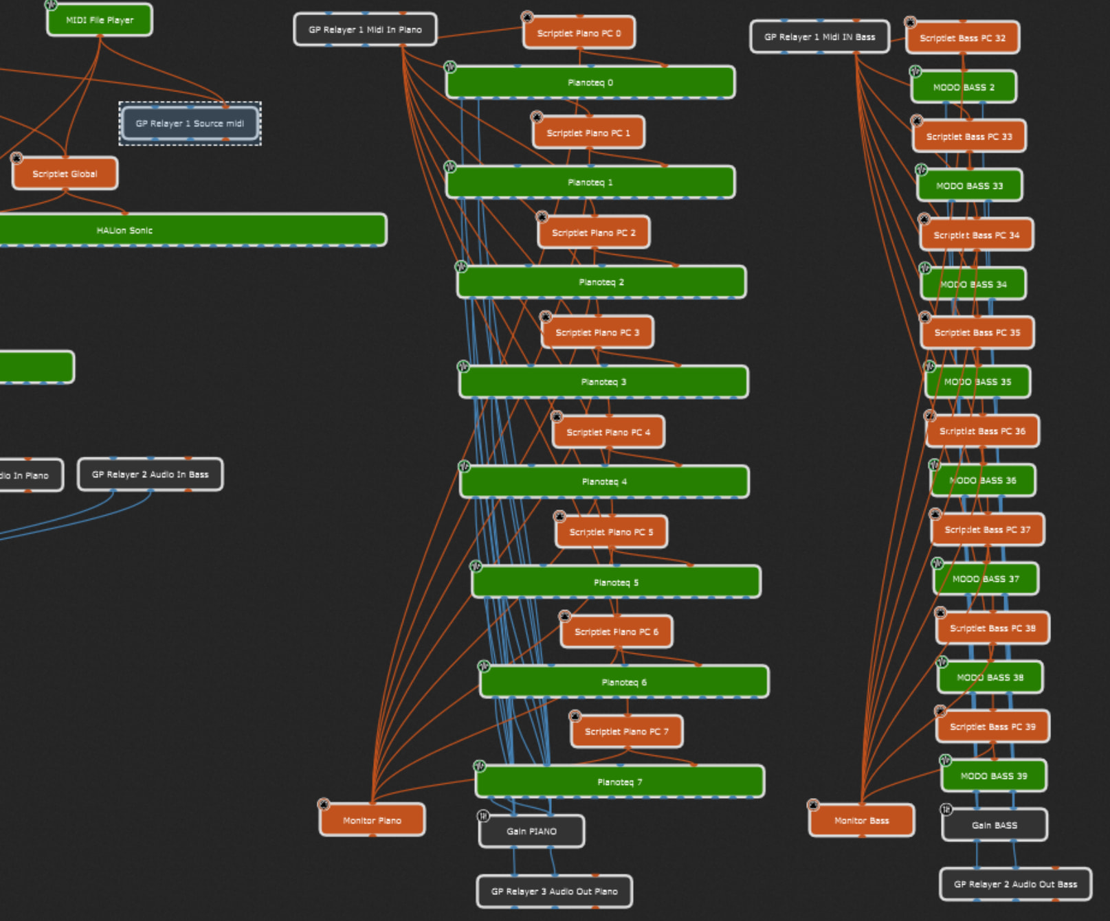 For each program change sent by the MIDI file, I retrieve the channel, remove everything on channel 10 (reserved for drums), then filter the program change to the correct sound (pianoteq 0 to 7 or modo bass 32 to 39). I added a transpose of +12 for modo bass…