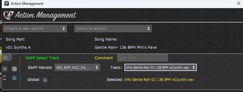 Now, if I put a song part action in the first song part of any of my songs, with the goal of selecting that song part and having the SAFP set itself to the corresponding track, then the next time I start playback via the global playhead GP’s UI becomes unresponsive, and the audio output becomes nothing but a very nasty buzz. This is reproducible, every time. GP does not crash, but I’m given no choice but to End Task and restart GP.