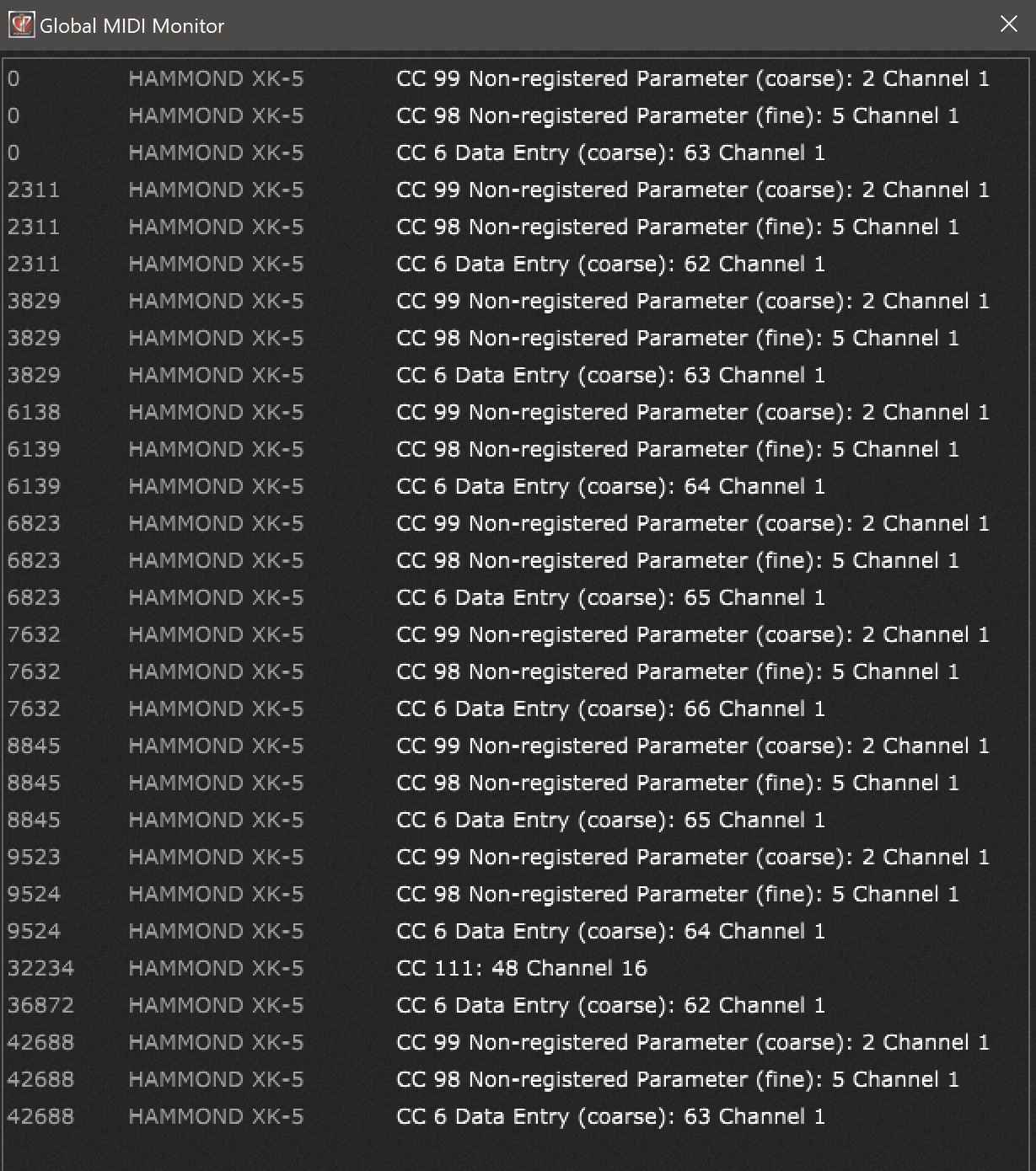 On ControlChangeEvent(CC_msg:ControlChangeMessage) Matching 99,98,6 from XK5