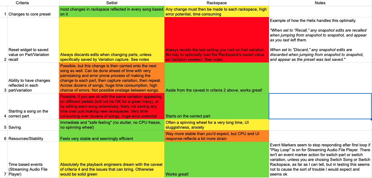 I just ran into a new problem with rackspaces, having so many songs as separate rackspaces really affected the gig file load time, I was looking at nearly three minutes to bring in 22 songs. I know three minutes doesn’t sound like much, but onstage that’s a few eternities. If there could be some way to make Setlist mode work well for this application (allowing the pedals to stay in their current order regardless of which part starts first, ignore variations working on a per song basis) that would be ideal. Gig file loading time is a lot shorter when its just a few rackspaces