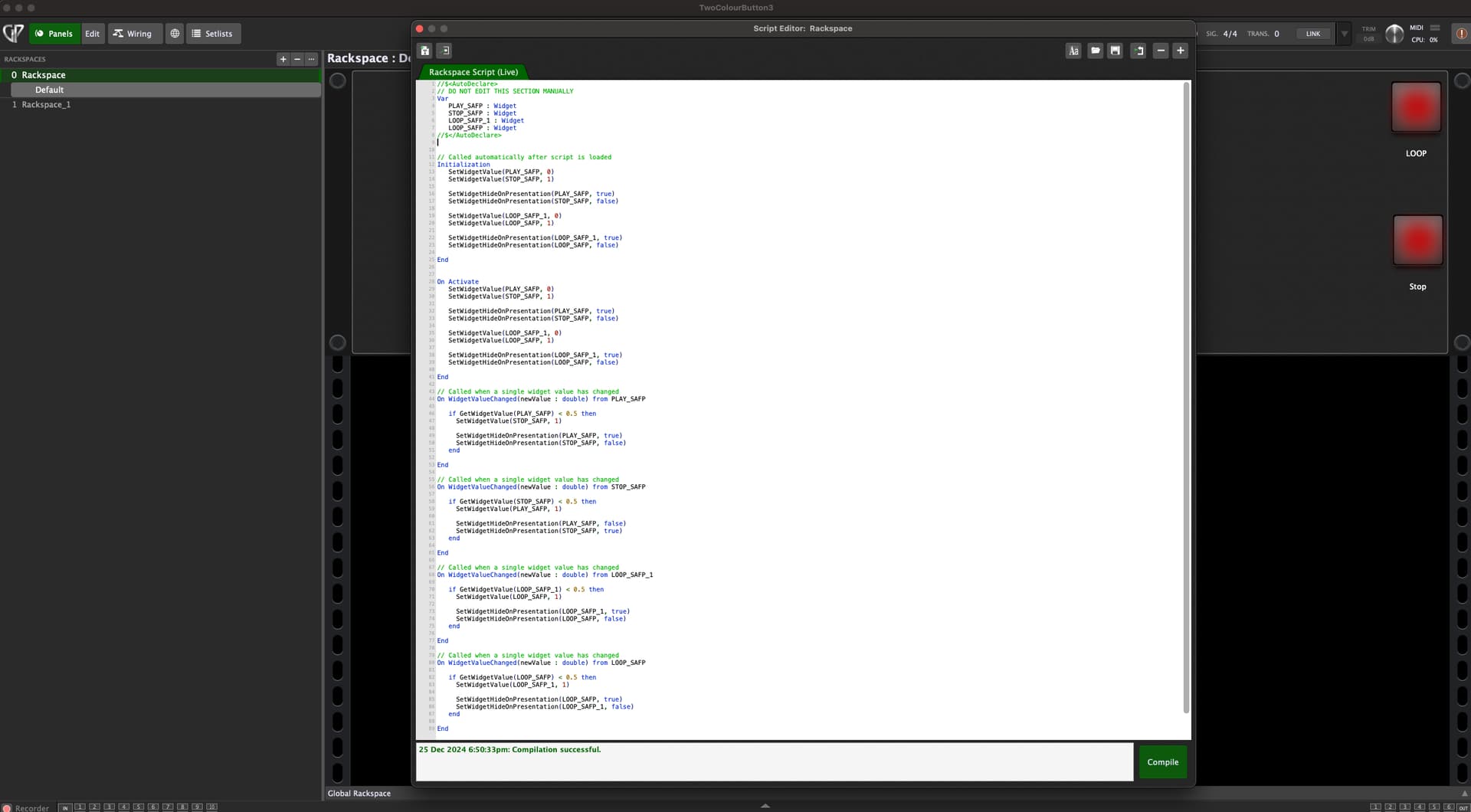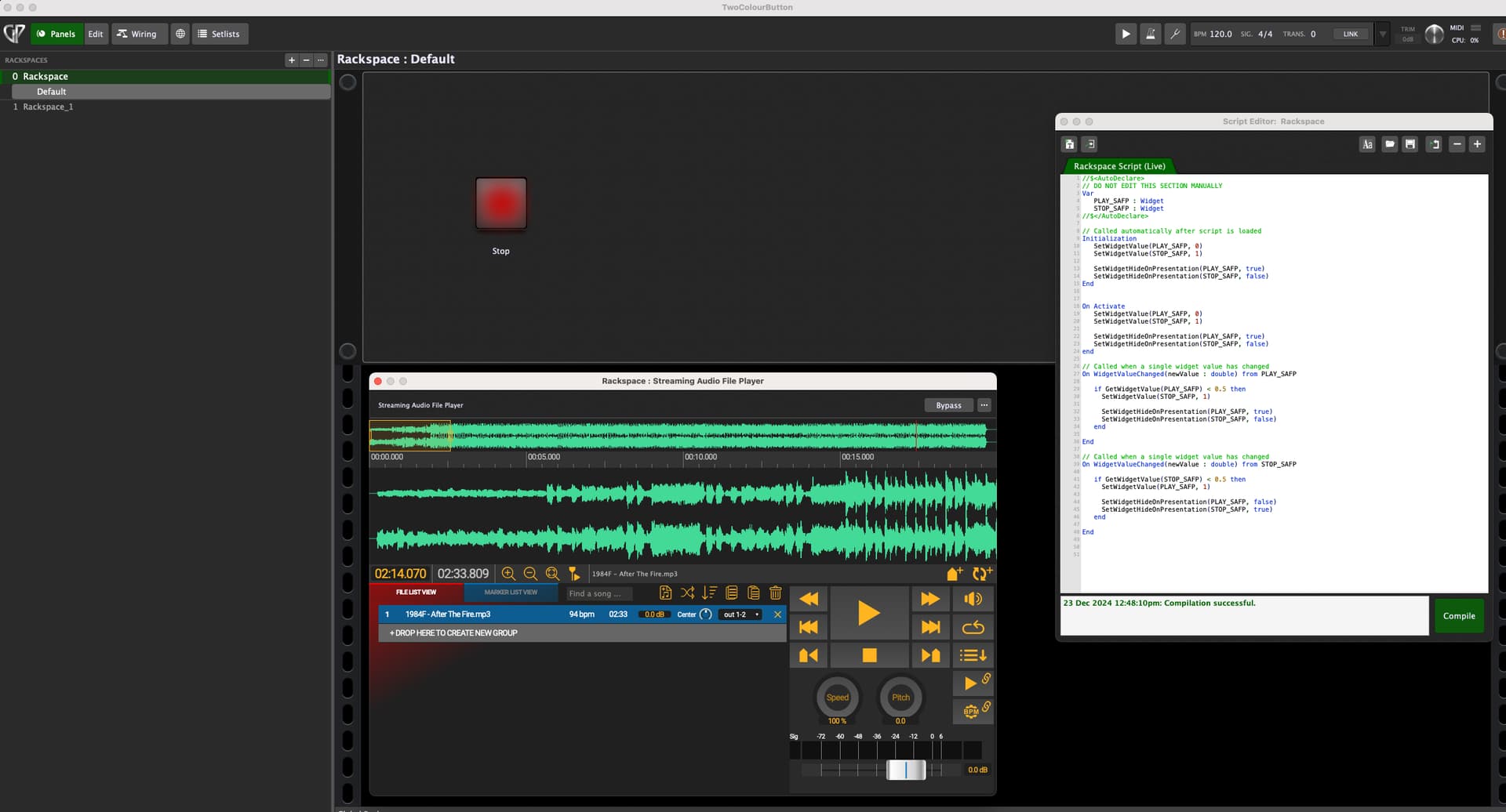 I actually made a rackspace with a script that has widgets which also react on the player’s functions for START/STOP/LOOP, means the widgets also change their state when you use one of the functions from within the player’s GUI.