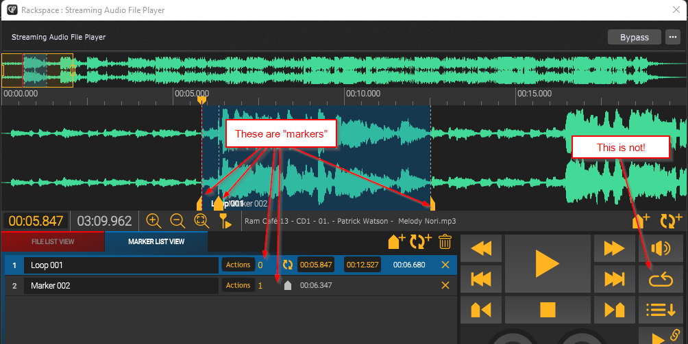 I only can guess that the behaviour of the LOOP button is what you called “a marker to set the player to loop”, but i’m not 100% sure and i just wanted to make sure that i wouldn’t have missed something when i give that gig file to you and it doesn’t work the way you want it to.