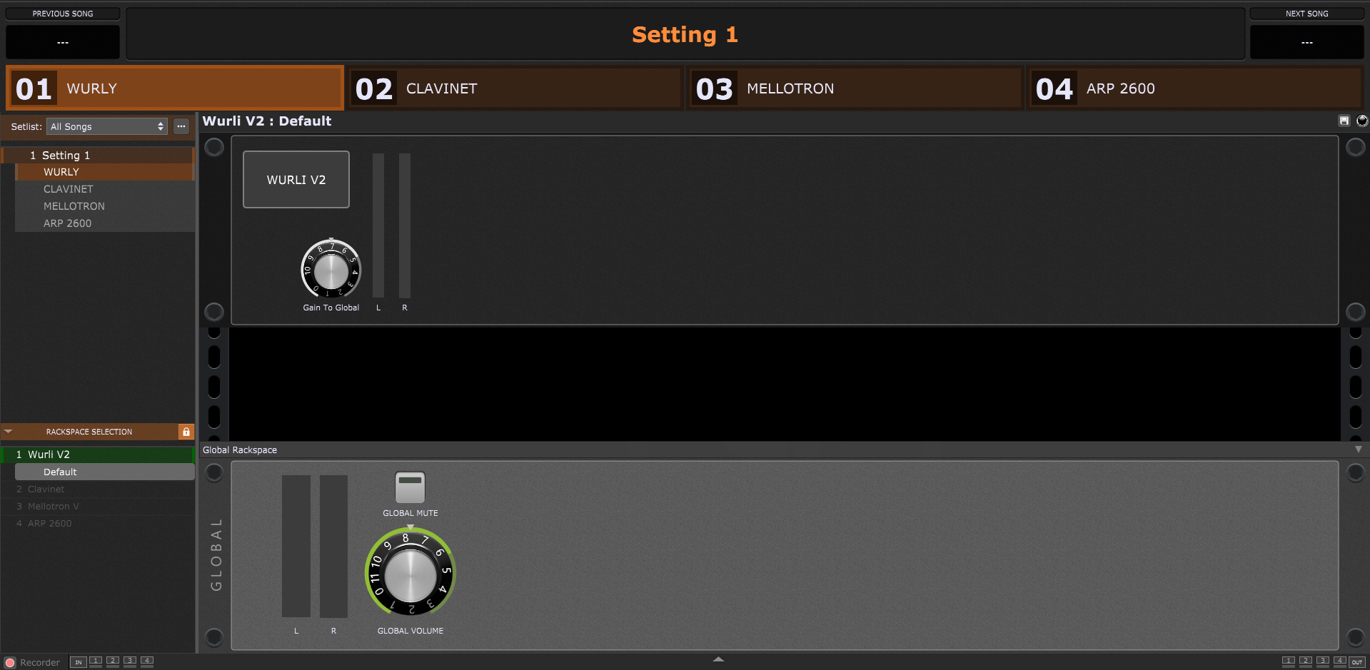 This is very similar to how I set up my system and I use Global Rackspace downstream of my local rackspaces to control mix and global effects like Leslie making it the last stop in the signal chain.