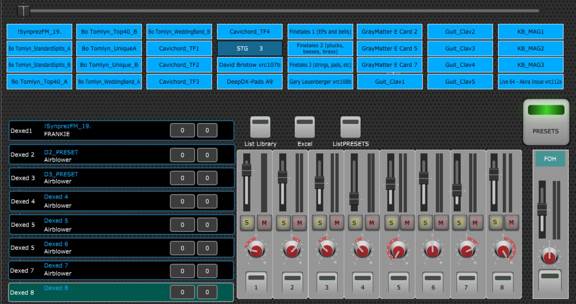If you toggle the PRESET button, the label changes to “PATCHES” and the tabs now become a list of the 32 patches for the selected PRESET for the selected Dexed.