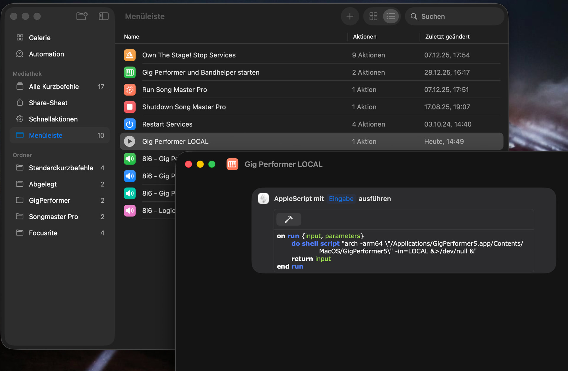 I actually have Gig Performer trigger a shortcut, too: to turn off low power mode on my MacBook in case I forgot to.
