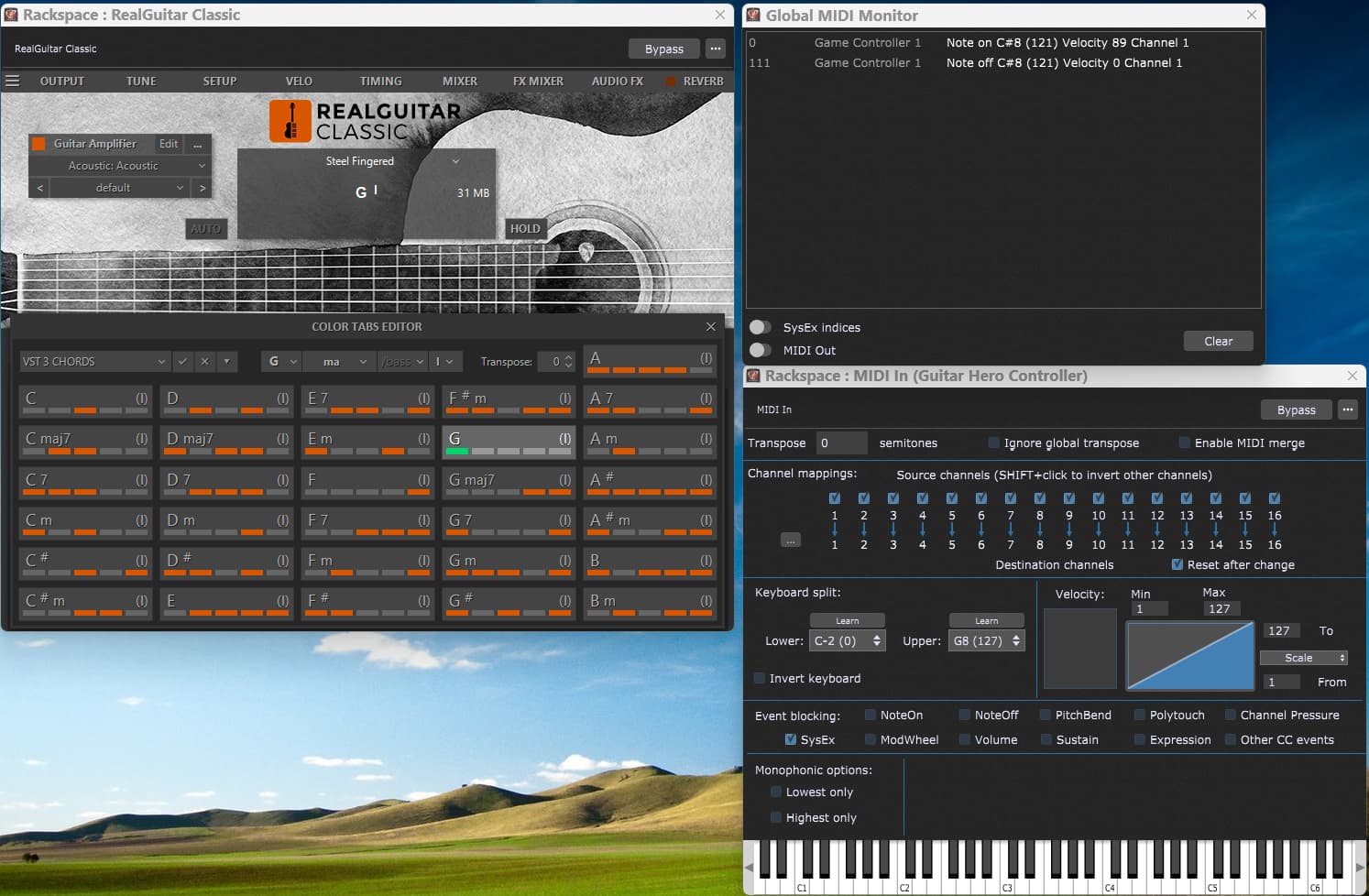 I am holding button one on the neck of the PS3 guitar controller which is sounding a G chord (green showing in the G chord highlight. Note that the Midi Monitor is saying that a C#8 note has been detected when the controller was strummed. Real Guitar is sounding a G chord over the PA