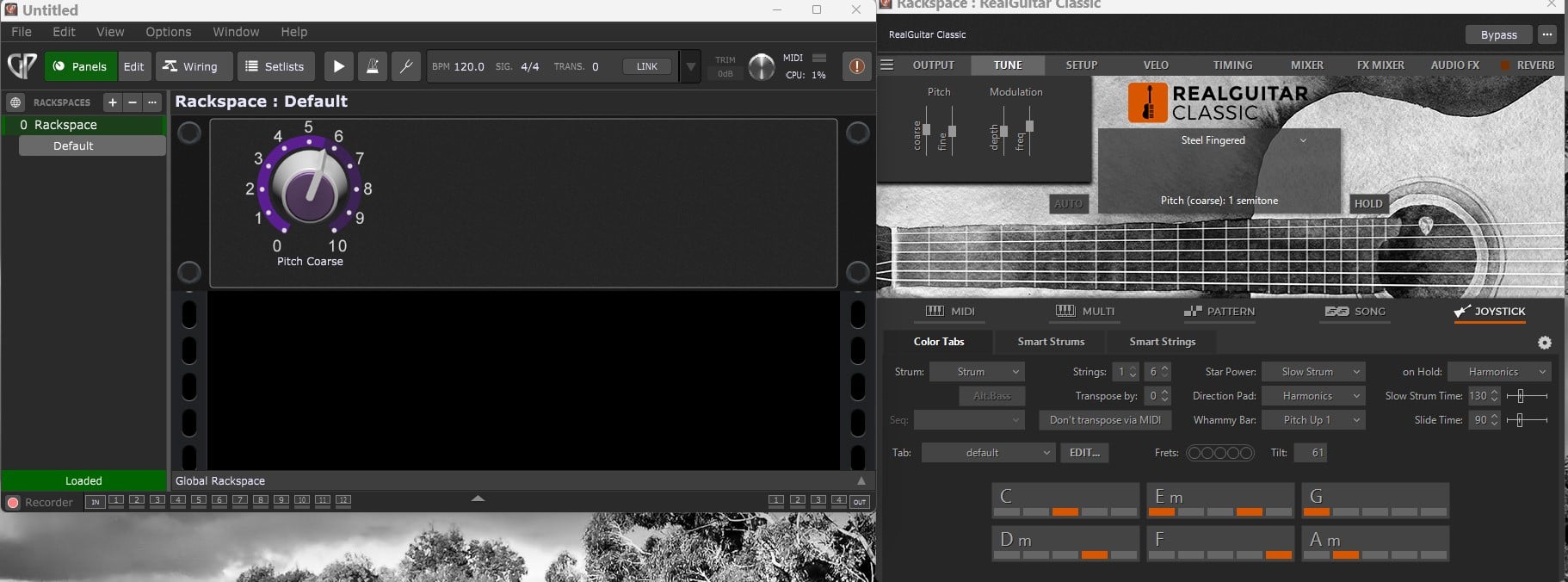 The notes just won’t play. Assuming that Real Guitar is set to joystick mode and the pS3 guitar controller is inputting the notes, then the moment that the midi input block is moved off zero transpose, the software won’t play the strums and picks as it’s supposed to. It’s just the way that the software writers created everything as an integrated unit. You may be saying by now, why bother. To me it’s well worth the effort. As a keyboard player, I could never be bothered learning to correctly play picking and strumming guitar, let alone learn the hundreds of chords involved. So for me, using Real Guitar in joystick mode allows me to play authentic sounding guitar reasonably easily.