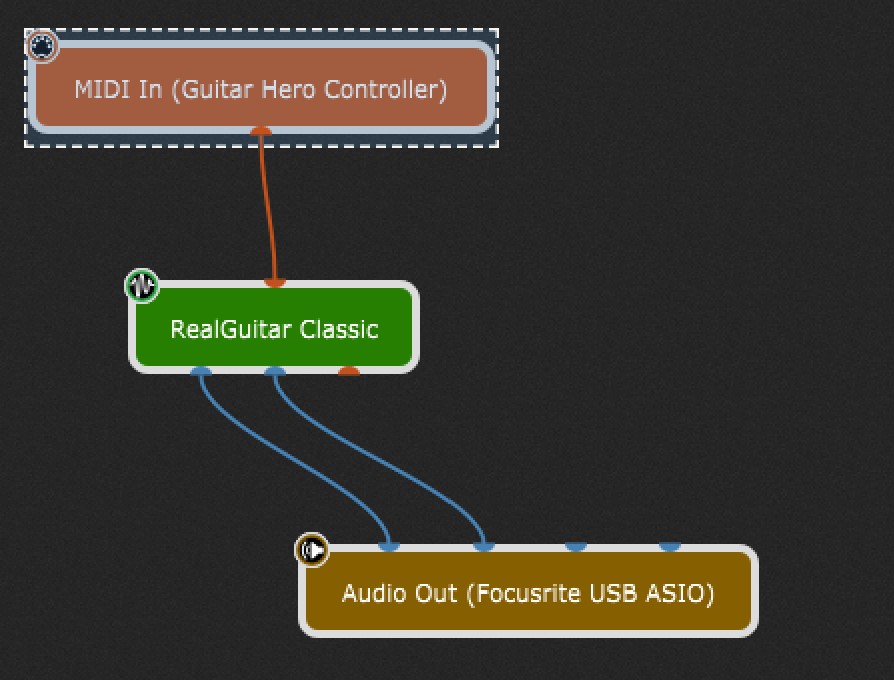 I’m away from home for the weekend and will be back home next Tuesday so I can’t send any screen shots. When I play a keyboard into GP using say a C chord, I get the notes C, E, and G. If I then play a C chord in a similar register using the PS3 controller, the midi notes show up many octaves higher (using notes based on 8 ie 8 octaves higher) even though the tones sound in the same register as the same notes from the keyboard. If I then transpose using the midi in block, the notes won’t sound at all and the joystick mode collapses and no notes will play. It must be in the way the ML guys have written the software so that all of the functions on the PS3 controller do what they are supposed to do. There is written on the RG main page for each guitar, “Do not transpose by midi.” The fact that I’ve managed to transpose at all is amazing I think. Keep in mind that they developed the joystick mode way back in 2012 and its seems to me have been an experiment that was never intended to be used in live performance but reserved for use at home for recording authentic guitar tracks. The original 5 neck button PS3 guitar controller hasn’t been manufactured for years and are to find second had these days. The replacement 6 button version doesn’t work I believe. I used to get some mild ribbing from people when I first went out playing live. “No frets! No strings! You’re a fake!” I got used to it in time and the fact is that the Real Guitars sound so darn good over a decent PA, and the joystick mode that allows strumming and picking is very real. If you had your back to me, you would guess that a real guitarist was playing.