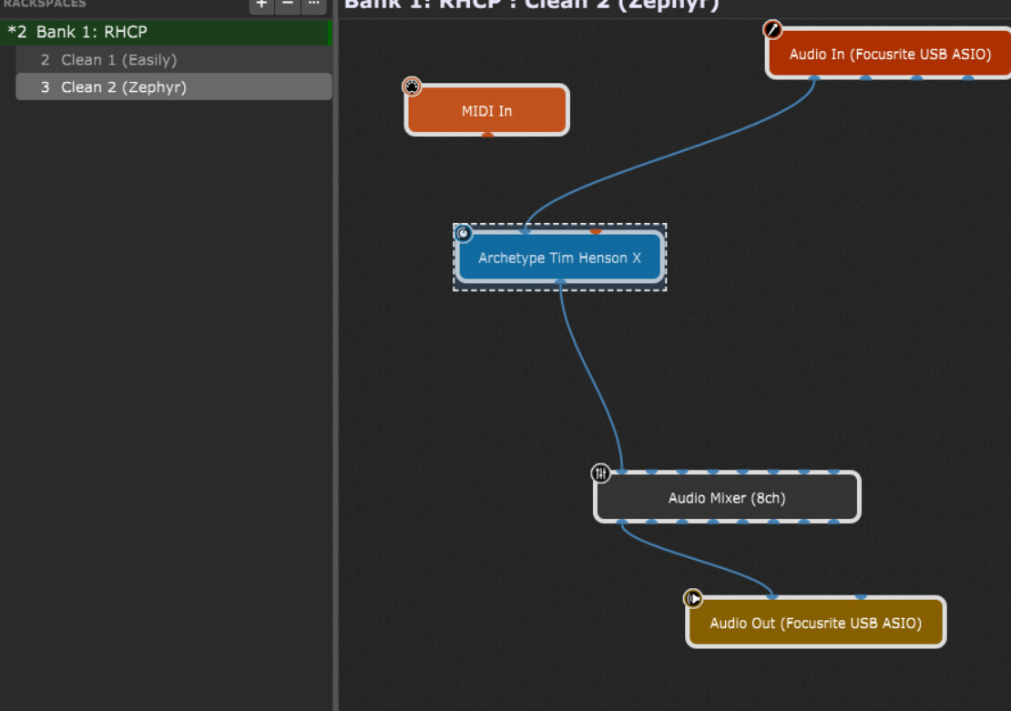 I’m using Gig Performer (latest version) with one rackspace that contains a single instance of Neural DSP Archetype Tim Henson.