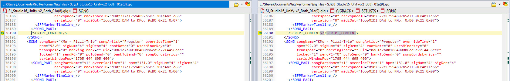 Between saving these two gig files, I did nothing at all in the Songs/Setlist area, yet the XML in this area is not identical.